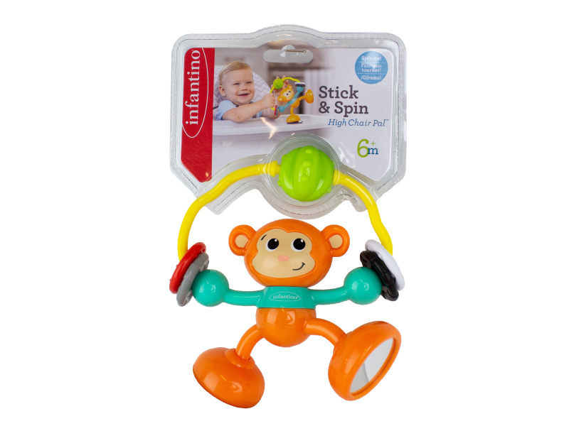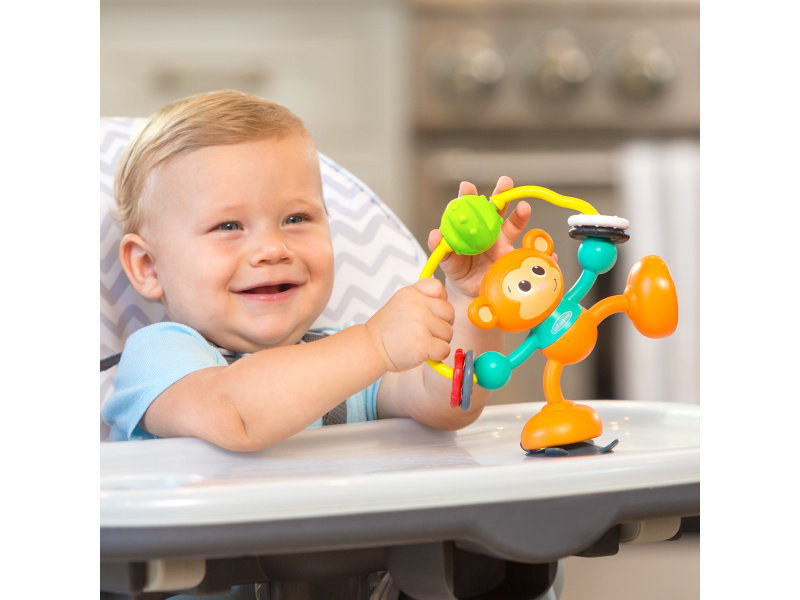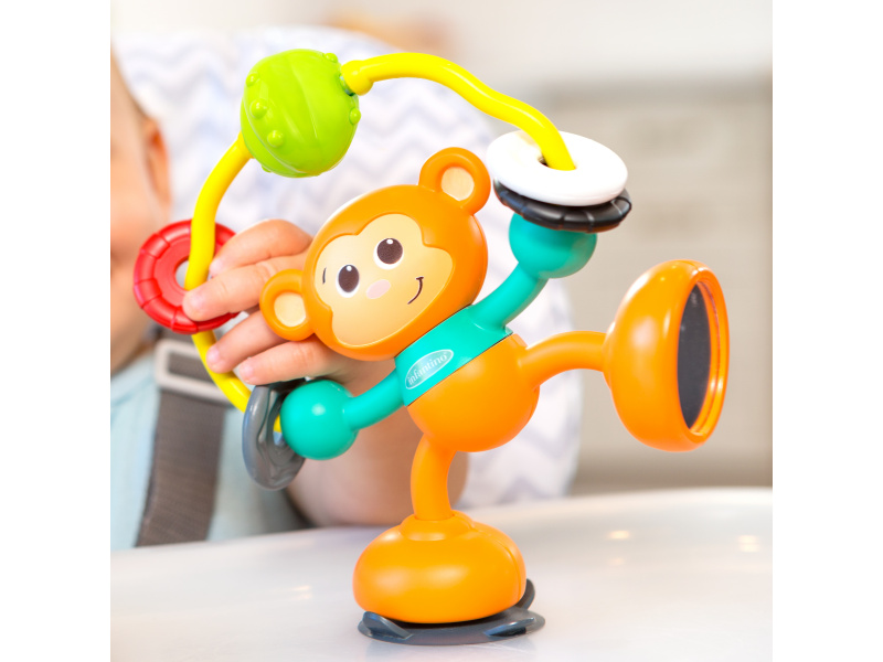 Hračku v podobě rošťácké opičky s přísavkou na jedné noze lze postavit na pult vysoké židličky, stůl apod. Při otáčení opičky se ozývá cvakání, pohyblivé kroužky a zrcátko na spodní straně druhé nohy lákají ke zkoumání. Hračka rozvíjí jemnou motoriku dítěte a učí jej vztahu příčina / následek. Vhodné pro děti od 6 měsíců.
