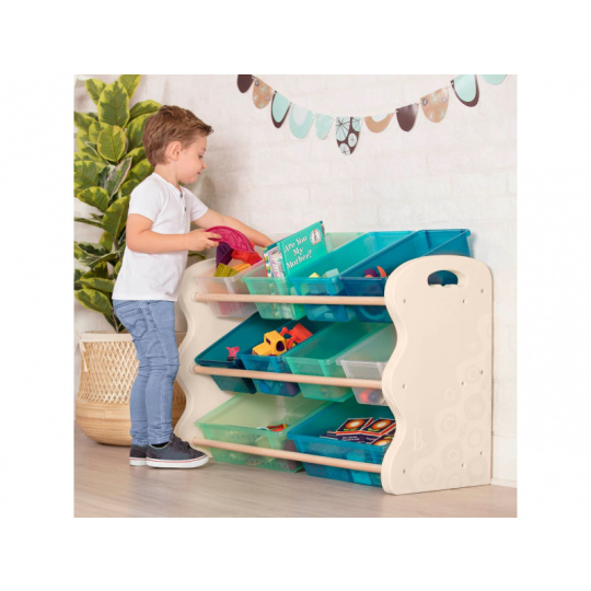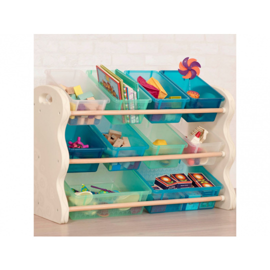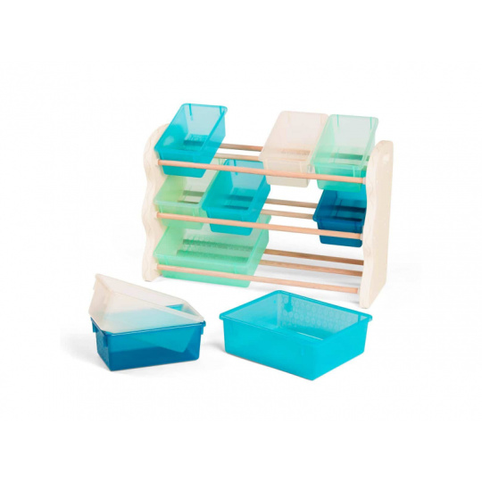 Stylový organizér na deset plastových boxů zjednoduší a zpříjemní vašim dětem každodenní úklid hraček, výtvarných potřeb apod. Boxy ze stojanu snadno vyjmete, takže pro hraní i uklízení si je vždy můžete odnést, kam potřebujete. Dvě velikosti boxů umožňují přehledné ukládání drobnějších i větších předmětů. Otvory na bočních stěnách organizéru usnadňují jeho uchopení a snadné přemístění. Materiál: boční stěny - plast, tyče - dřevo Rozměry: 90 x 67 x 37 cm