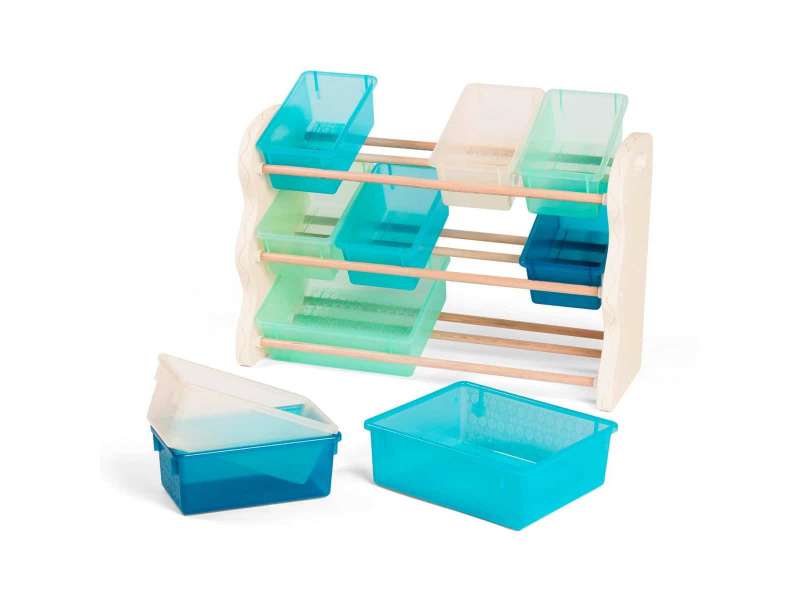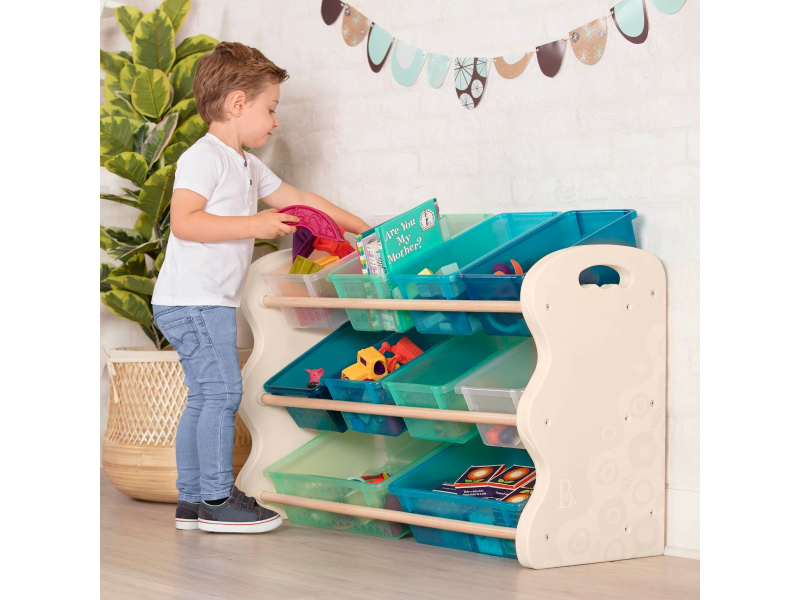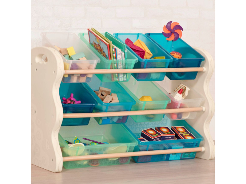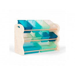 Stylový organizér na deset plastových boxů zjednoduší a zpříjemní vašim dětem každodenní úklid hraček, výtvarných potřeb apod. Boxy ze stojanu snadno vyjmete, takže pro hraní i uklízení si je vždy můžete odnést, kam potřebujete. Dvě velikosti boxů umožňují přehledné ukládání drobnějších i větších předmětů. Otvory na bočních stěnách organizéru usnadňují jeho uchopení a snadné přemístění. Materiál: boční stěny - plast, tyče - dřevo Rozměry: 90 x 67 x 37 cm