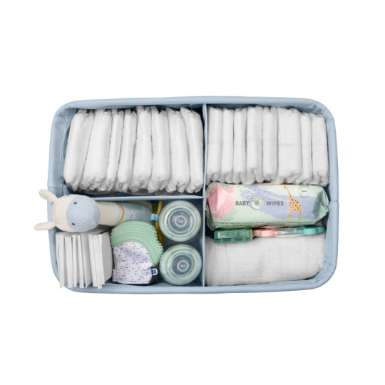 Praktický přenosný organizér v krásném textilním provedení s vnitřními přehrádkami vám pomůže přehledně uložit toaletní a přebalovací potřeby pro vaše miminko. Díky držadlům se snadno přenáší a můžete jej tak mít vždy po ruce kdekoli potřebujete. Odnímatelná přepážka umožnuje volbu členění vnitřního prostoru. Když organizér nepoužíváte, snadno jej složíte do plochého tvaru pro uložení. Složení: 100% polyester Rozměry: 42 x 27 x 17 cm