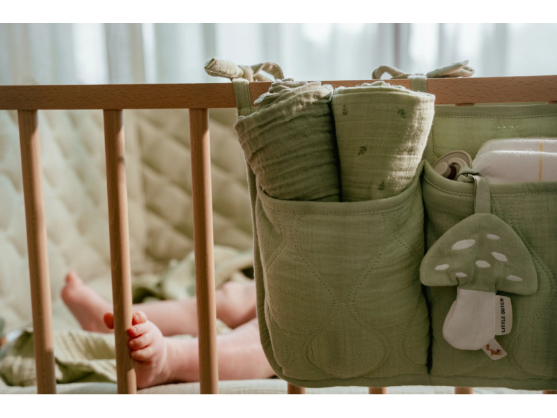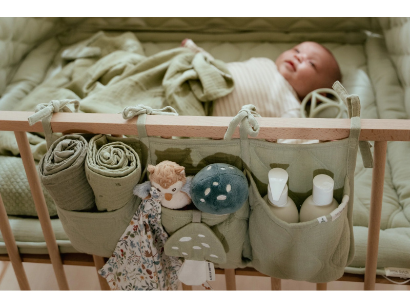 Praktický závěsný organizér v krásném provedení s ozdobným prošíváním vám umožní mít vše potřebné pro péči o vaše miminko vždy po ruce. Organizér ze 100% organické bavlny nabízí tři prostorné kapsy pro uložení dudlíků, bryndáčků, plen, ubrousků, hraček apod. Pomocí praktických vázacích šňůrek jej snadno připevníte k přebalovacímu pultu, na stěnu či na postýlku. Organizér je součástí designové kolekce textilu a doplňků Little Dutch Pure. Složení: 100% organická bavlna, výplň 100% polyester Rozměry: 42 x 22 cm Možno prát v pračce.