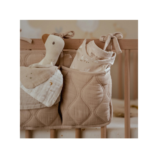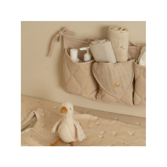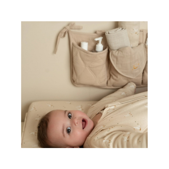 Praktický závěsný organizér v krásném provedení s ozdobným prošíváním vám umožní mít vše potřebné pro péči o vaše miminko vždy po ruce. Organizér ze 100% organické bavlny nabízí tři prostorné kapsy pro uložení dudlíků, bryndáčků, plen, ubrousků, hraček apod. Pomocí praktických vázacích šňůrek jej snadno připevníte k přebalovacímu pultu, na stěnu či na postýlku. Organizér je součástí designové kolekce textilu a doplňků Little Dutch Pure. Složení: 100% organická bavlna, výplň 100% polyester Rozměry: 42 x 22 cm Možno prát v pračce.