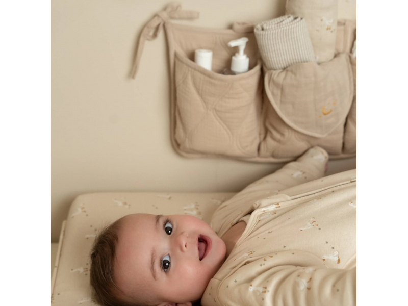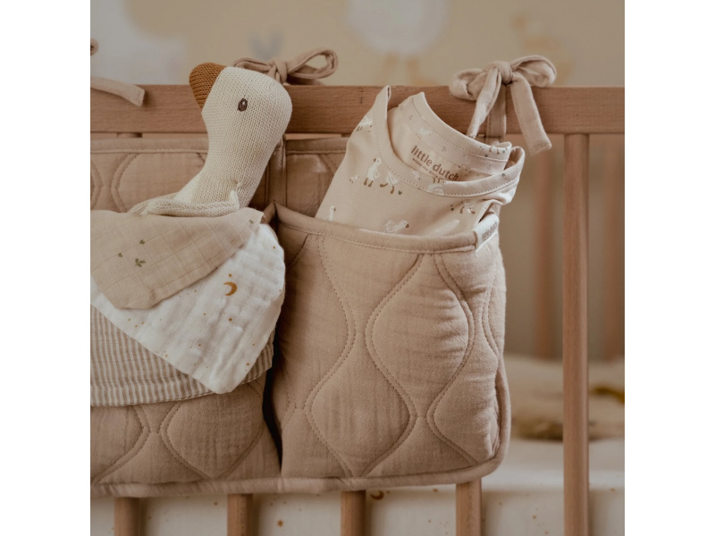 Praktický závěsný organizér v krásném provedení s ozdobným prošíváním vám umožní mít vše potřebné pro péči o vaše miminko vždy po ruce. Organizér ze 100% organické bavlny nabízí tři prostorné kapsy pro uložení dudlíků, bryndáčků, plen, ubrousků, hraček apod. Pomocí praktických vázacích šňůrek jej snadno připevníte k přebalovacímu pultu, na stěnu či na postýlku. Organizér je součástí designové kolekce textilu a doplňků Little Dutch Pure. Složení: 100% organická bavlna, výplň 100% polyester Rozměry: 42 x 22 cm Možno prát v pračce.