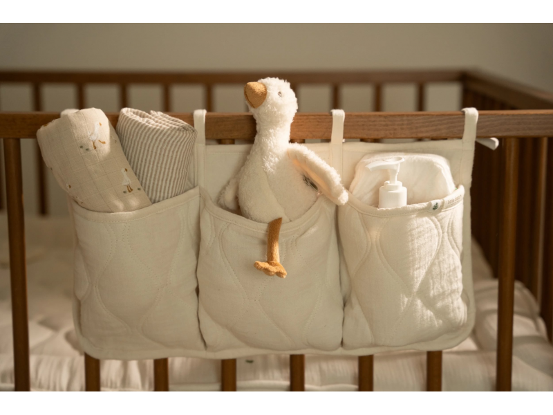 Praktický závěsný organizér v krásném provedení s ozdobným prošíváním vám umožní mít vše potřebné pro péči o vaše miminko vždy po ruce. Organizér ze 100% organické bavlny nabízí tři prostorné kapsy pro uložení dudlíků, bryndáčků, plen, ubrousků, hraček apod. Pomocí praktických vázacích šňůrek jej snadno připevníte k přebalovacímu pultu, na stěnu či na postýlku. Organizér je součástí designové kolekce textilu a doplňků Little Dutch Pure.  Složení: 100% organická bavlna, výplň 100% polyester Rozměry: 42 x 22 cm Možno prát v pračce.