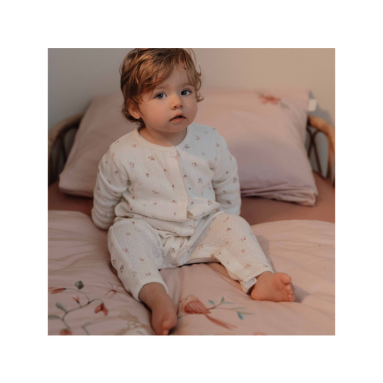 Overal na spaní z měkké organické bavlny s jemným květinovým potiskem má zapínání na patentky na přední straně a v rozkroku pro snadné oblékání i přebalování dítěte. Overal je součástí designové kolekce textilu, hraček a doplňků Little Dutch Fairy Garden inspirované životem na zahradě. Složení: 100% organická bavlna