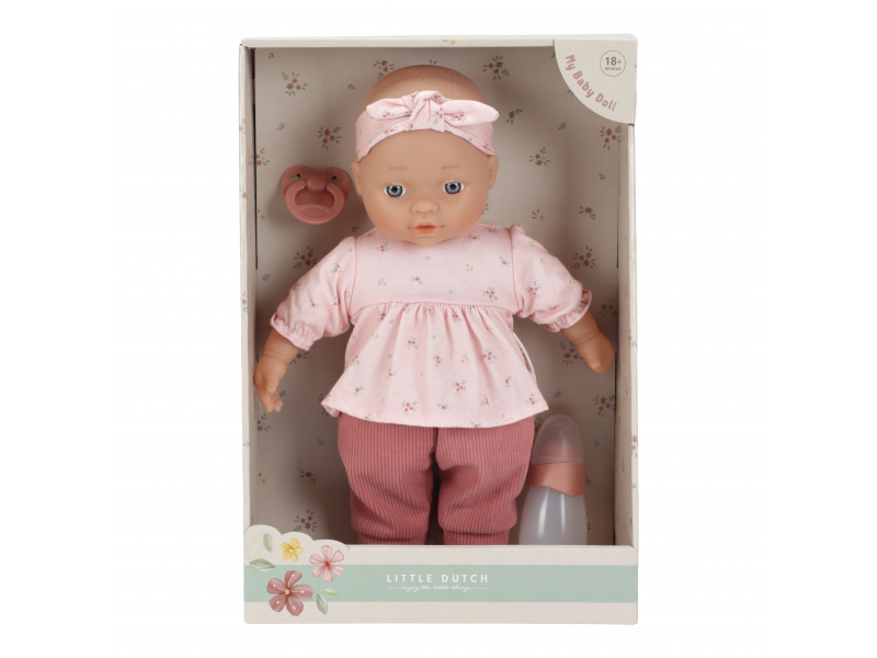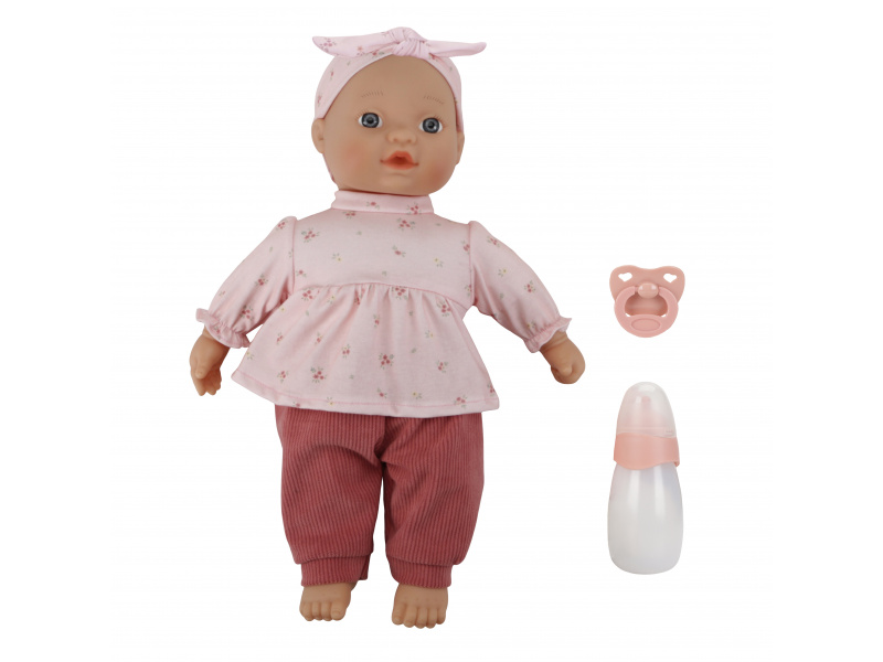 Roztomilou panenku v podobě miminka může vaše holčička i chlapeček převlékat, chovat, krmit lahvičkou, uklidňovat dudlíkem i vozit v kočárku. Panenka je oblečena do něžných růžových šatiček, žebrovaných kalhot a čelenky, součástí balení je i lahvička a dudlík. K panence je možné dokoupit samostatně prodejný kočárek, golfky, postýlku i další oblečení. Rozměry: 36 x 24 x 12 cm Vhodné pro děti od 18 měsíců.