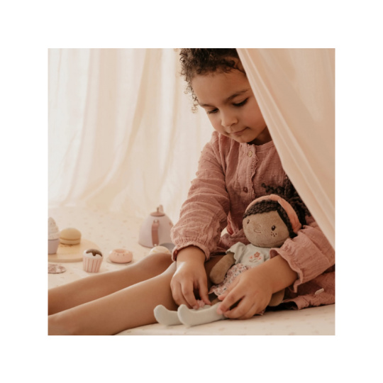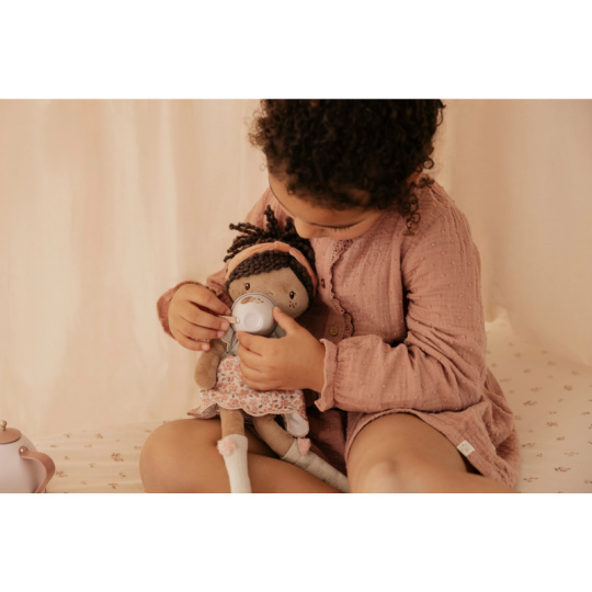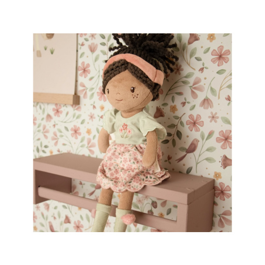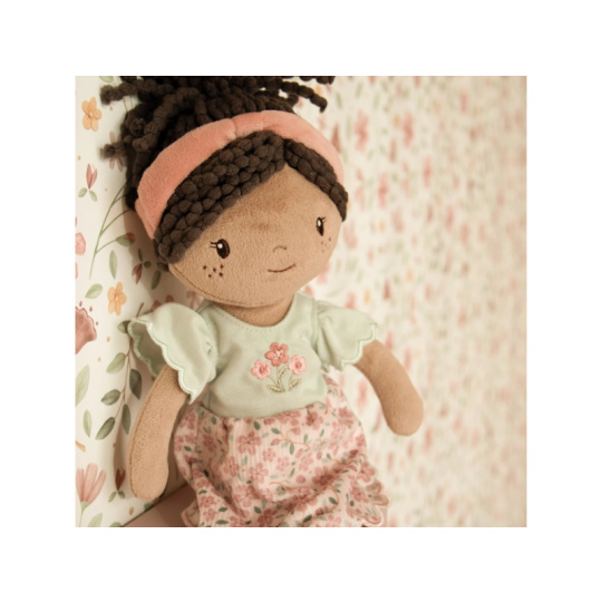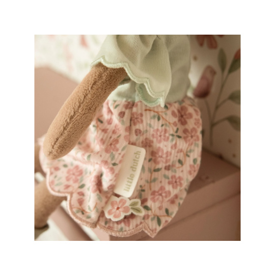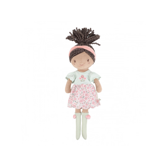 Něžná plyšová panenka Evi z měkkého jemného materiálu je oblečená do krásných květovaných šatiček. Je vhodná na hraní i mazlení a bude se s ní i krásně usínat! Výplň je vyrobena ze 100% recyklovaného polyesteru s certifikací GRS (Global Recycled Standard). Rozměry: 35 x 11 x 6 cm Složení: 100% polyester Možno prát v pračce na 30°C. Vhodné pro děti od 12 měsíců.
