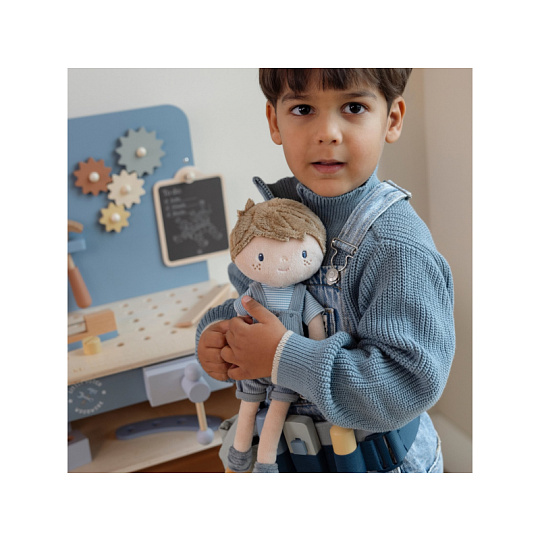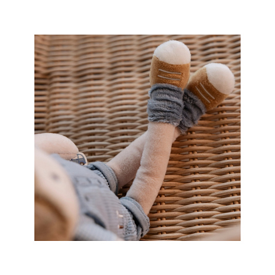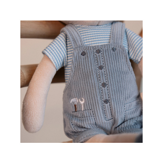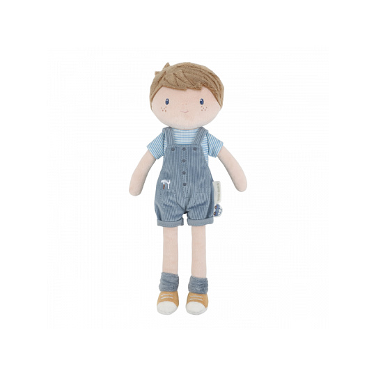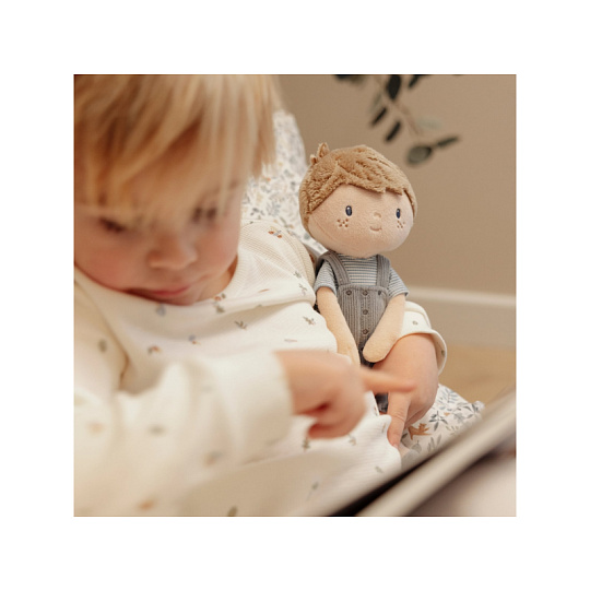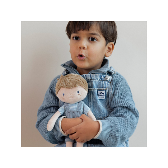 Originální plyšová panenka v podobě chlapečka Jima v manšestrových kalhotách s laclem. Panenka z měkkého jemného materiálu je ideální jako první panenka pro vaše dítě, je vhodná na hraní i mazlení a bude se s ní i krásně usínat! Výplň je vyrobena ze 100% recyklovaného polyesteru s certifikací GRS (Global Recycled Standard). Rozměry: 35 x 14 x 7 cm Složení: 100% polyester Možno prát v pračce na 30°C. Vhodné pro děti od 12 měsíců.