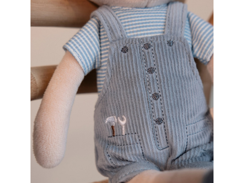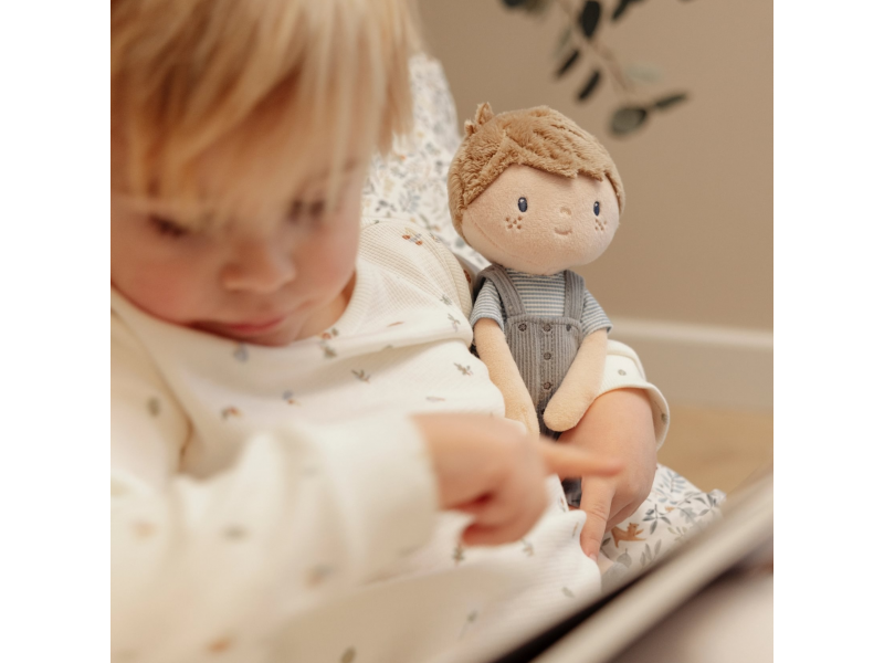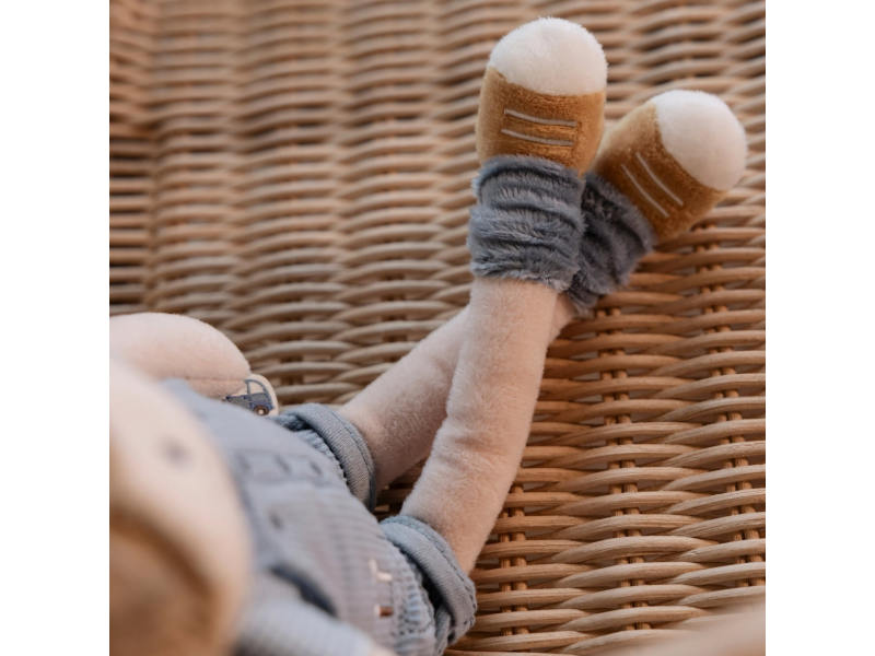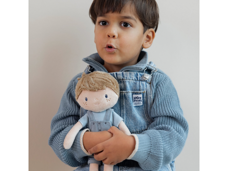 Originální plyšová panenka v podobě chlapečka Jima v manšestrových kalhotách s laclem. Panenka z měkkého jemného materiálu je ideální jako první panenka pro vaše dítě, je vhodná na hraní i mazlení a bude se s ní i krásně usínat! Výplň je vyrobena ze 100% recyklovaného polyesteru s certifikací GRS (Global Recycled Standard). Rozměry: 35 x 14 x 7 cm Složení: 100% polyester Možno prát v pračce na 30°C. Vhodné pro děti od 12 měsíců.