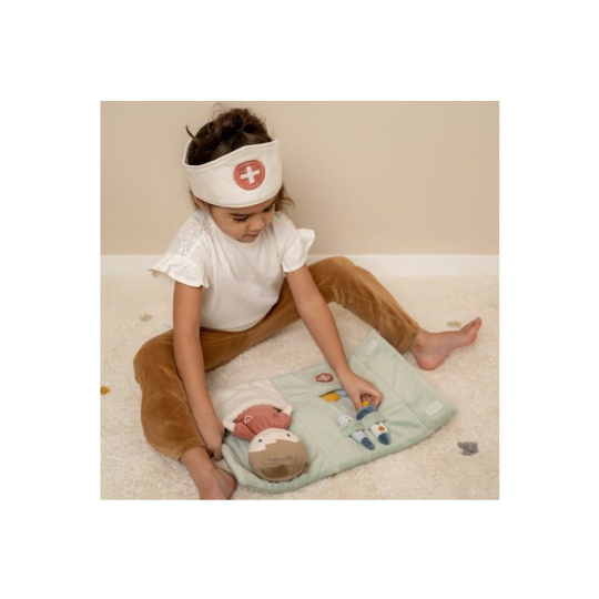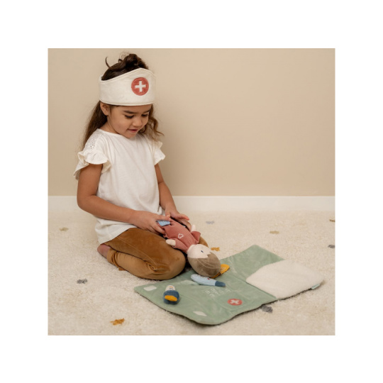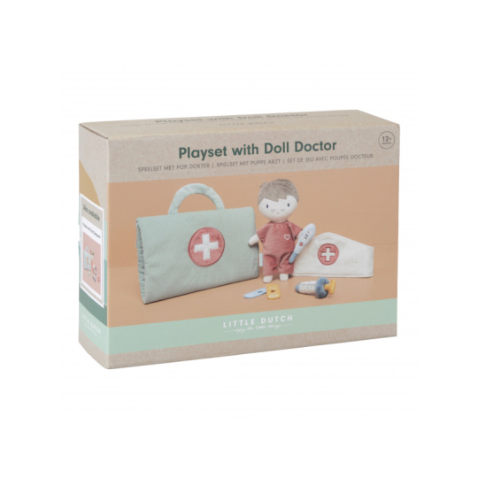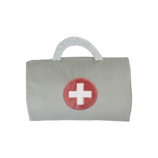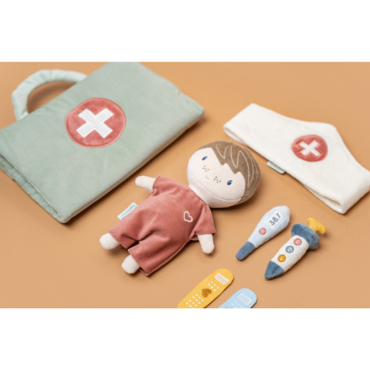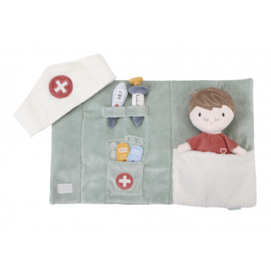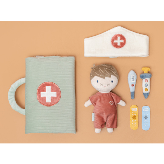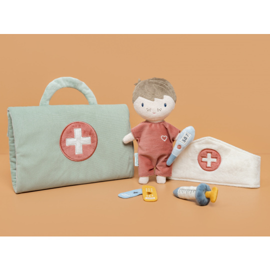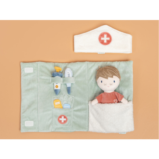 Originální sada s panenkou Jimem a lékařskými doplňky v krásném provedení z jemného plyšového materiálu. Jim se necítí dobře a bude potřebovat vyšetřit a uložit do postýlky. Váš malý lékař nebo lékařka si nasadí čepec a s pomocí teploměru zkontroluje Jimovi teplotu. Pokud bude potřeba zahájit léčbu, má k dispozci injekční stříkačku i náplasti. Až hra skončí, snadno celou sadu zabalíte do tvaru pouzdra s držadlem. Díky svému provedení je sada vhodná i jako hračka na zabavení vašeho dítěte na cestách. Možno prát v pračce. Vhodné pro děti od 12 měsíců.