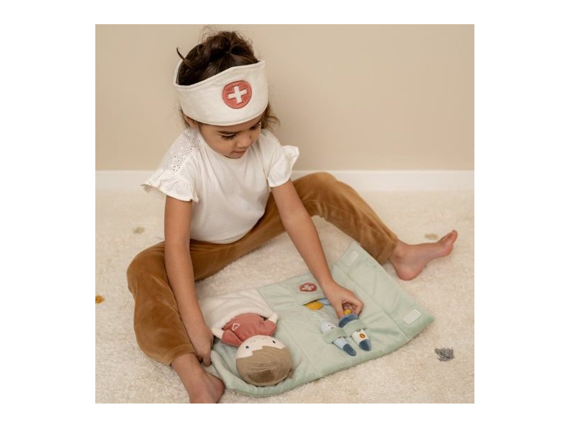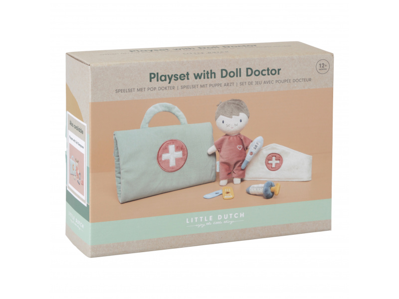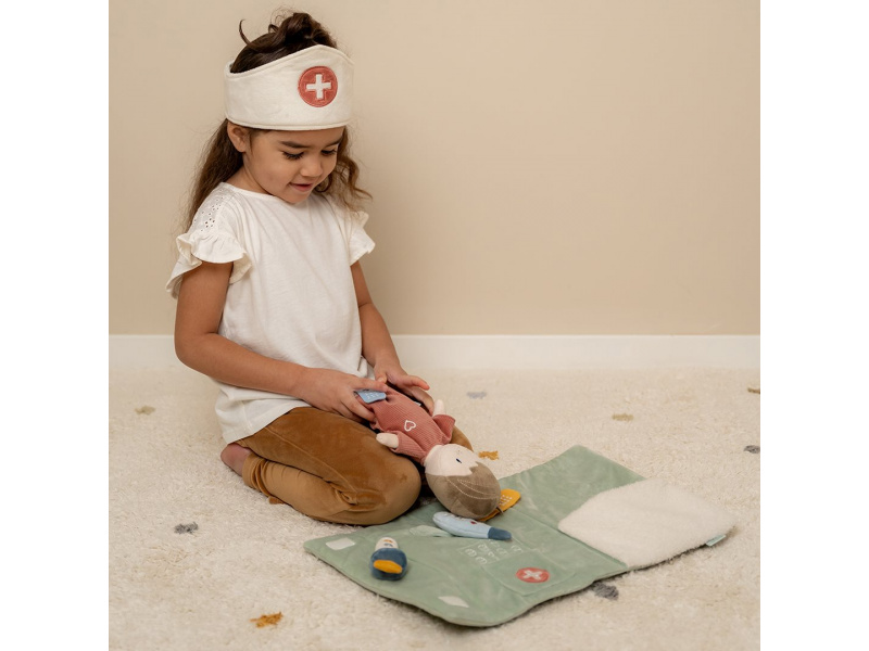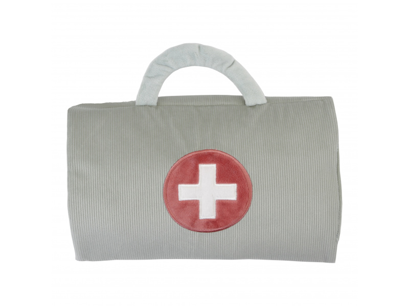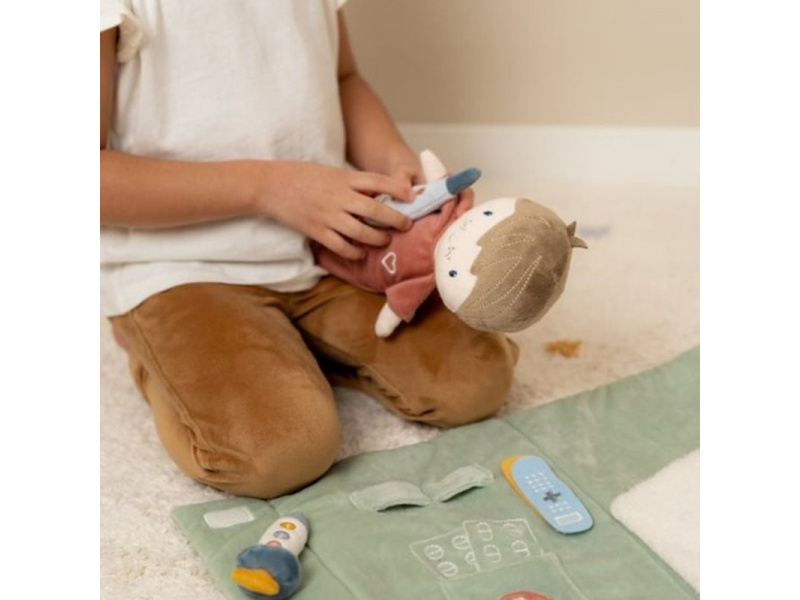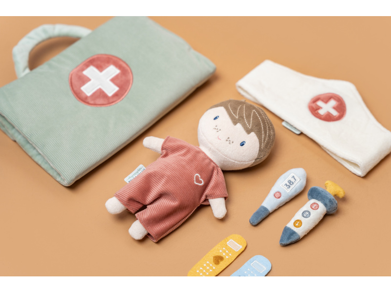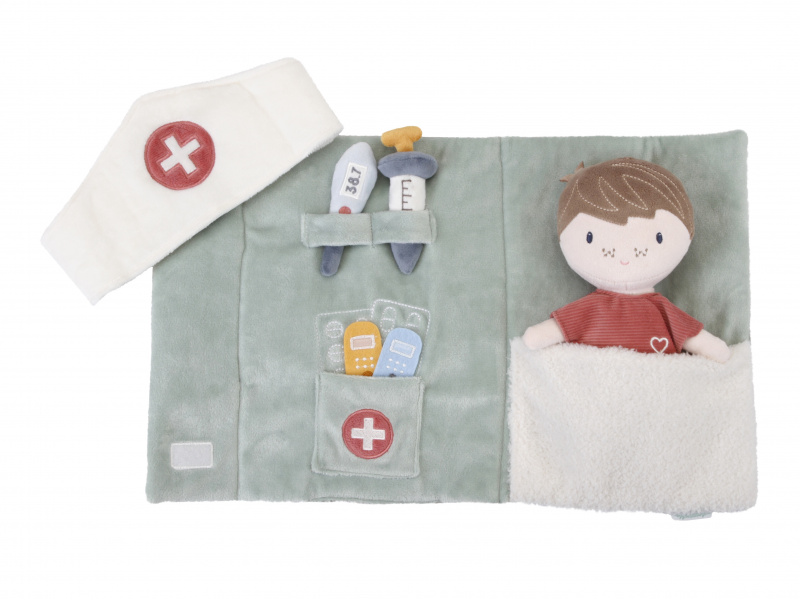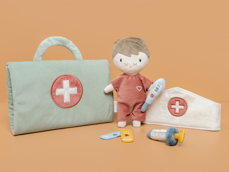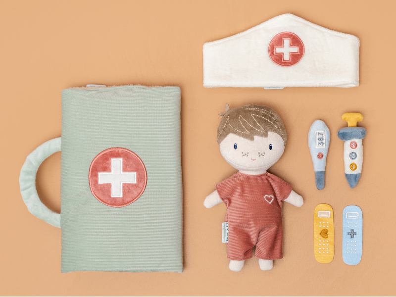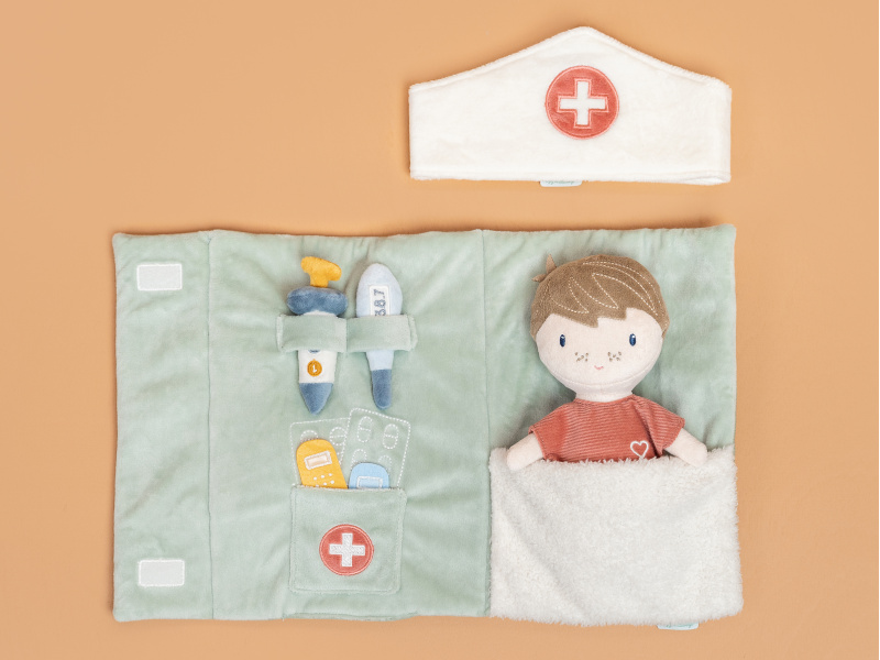 Originální sada s panenkou Jimem a lékařskými doplňky v krásném provedení z jemného plyšového materiálu. Jim se necítí dobře a bude potřebovat vyšetřit a uložit do postýlky. Váš malý lékař nebo lékařka si nasadí čepec a s pomocí teploměru zkontroluje Jimovi teplotu. Pokud bude potřeba zahájit léčbu, má k dispozci injekční stříkačku i náplasti. Až hra skončí, snadno celou sadu zabalíte do tvaru pouzdra s držadlem. Díky svému provedení je sada vhodná i jako hračka na zabavení vašeho dítěte na cestách. Možno prát v pračce. Vhodné pro děti od 12 měsíců.