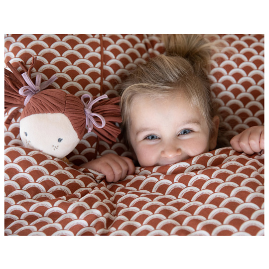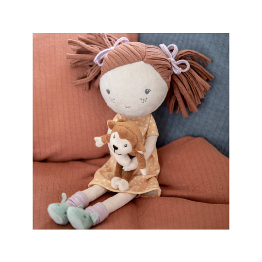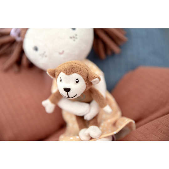 Něžná plyšová panenka Sophia z měkkého jemného materiálu je oblečená do krásných puntíkovaných šatiček. Panenka drží v ruce malou plyšovou opičku, připevněnou suchým zipem. Je vhodná na hraní i mazlení a bude se s ní i krásně usínat! Výplň je vyrobena ze 100% recyklovaného polyesteru s certifikací GRS (Global Recycled Standard). Rozměry: 35 x 9 x 6 cm Složení: 100% polyester Možno prát v pračce na 30°C. Vhodné pro děti od 12 měsíců.
