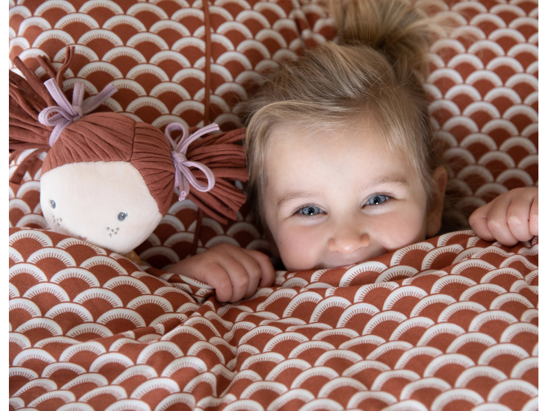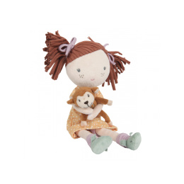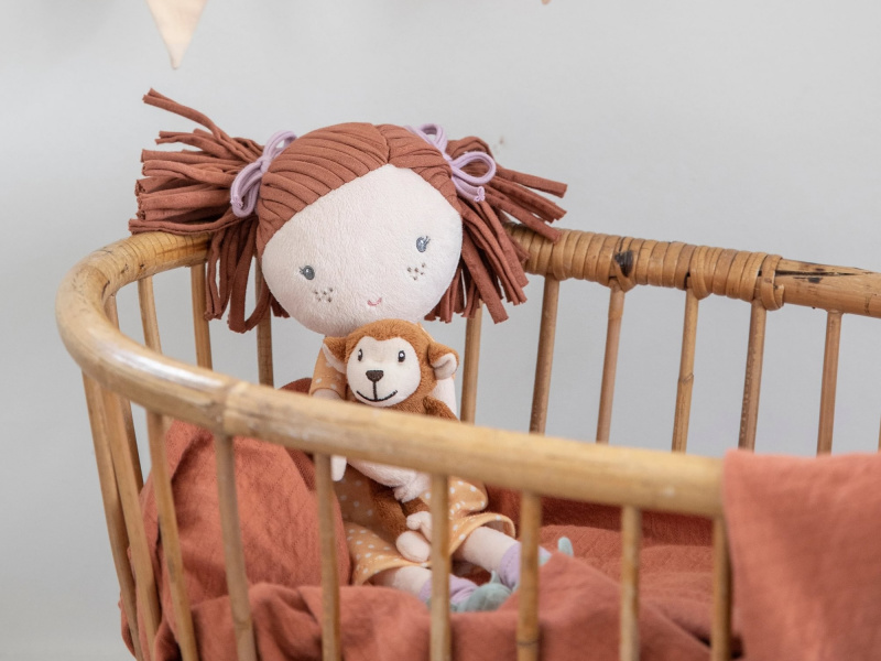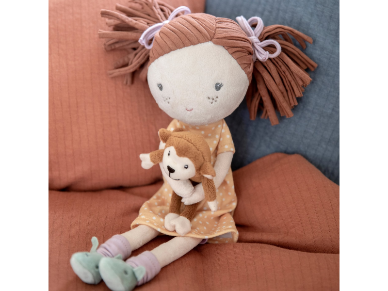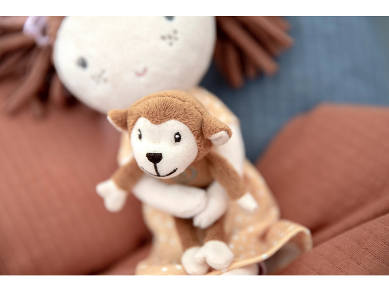 Něžná plyšová panenka Sophia z měkkého jemného materiálu je oblečená do krásných puntíkovaných šatiček. Panenka drží v ruce malou plyšovou opičku, připevněnou suchým zipem. Je vhodná na hraní i mazlení a bude se s ní i krásně usínat! Výplň je vyrobena ze 100% recyklovaného polyesteru s certifikací GRS (Global Recycled Standard). Rozměry: 35 x 9 x 6 cm Složení: 100% polyester Možno prát v pračce na 30°C. Vhodné pro děti od 12 měsíců.