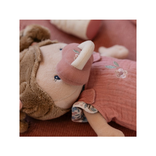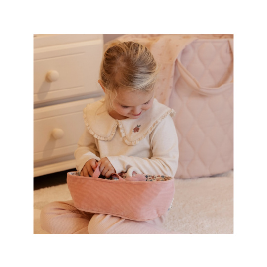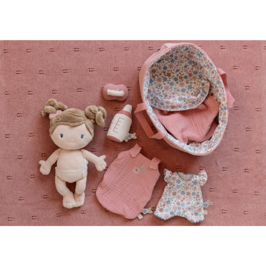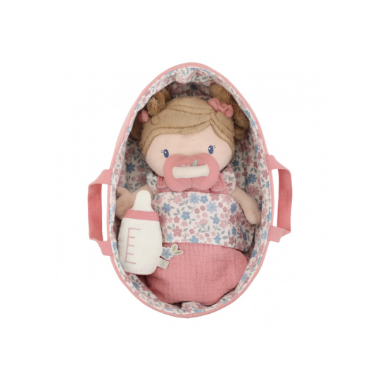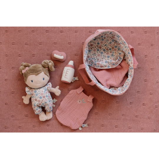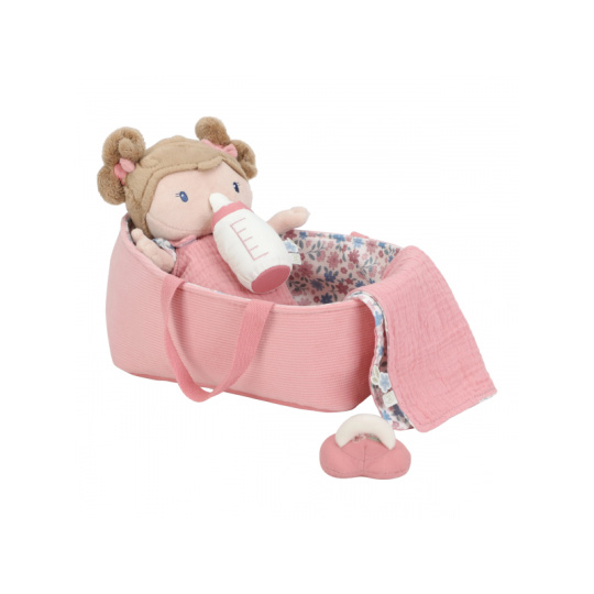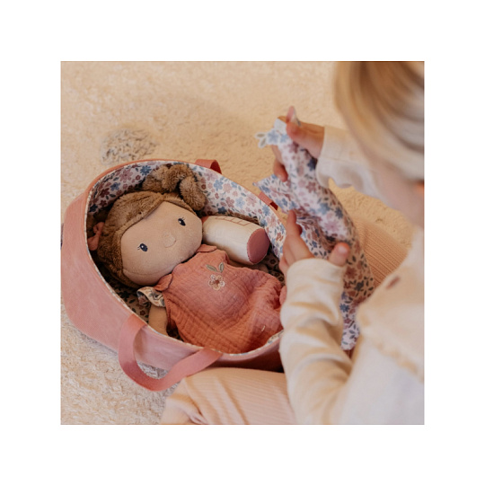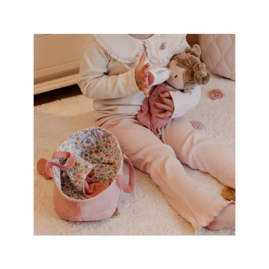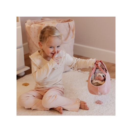 Něžná plyšová panenka Rosa se chce mazlit a chovat a díky praktickému košíku na spaní si ji můžete vzít kamkoli s sebou. Péče o takové miminko dá zabrat, a děti se tak hravou formou učí odpovědnosti. Rosu je potřeba pravidelně nakrmit nebo jí dát dudlík. Na spaní je potřeba Rosu uložit do spacího pytle a přikrýt dekou, aby jí nebyla zima. Výplň je vyrobena ze 100% recyklovaného polyesteru s certifikací GRS (Global Recycled Standard). Rozměry: 25 x 22 x 9 cm Složení: 50% polyester, 50% bavlna Možno prát v ruce. Vhodné pro děti od 12 měsíců.