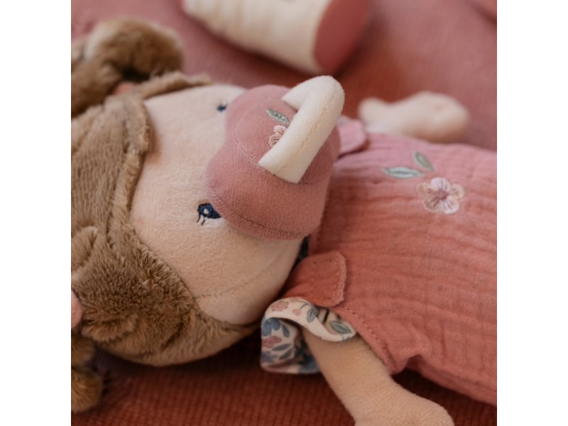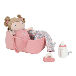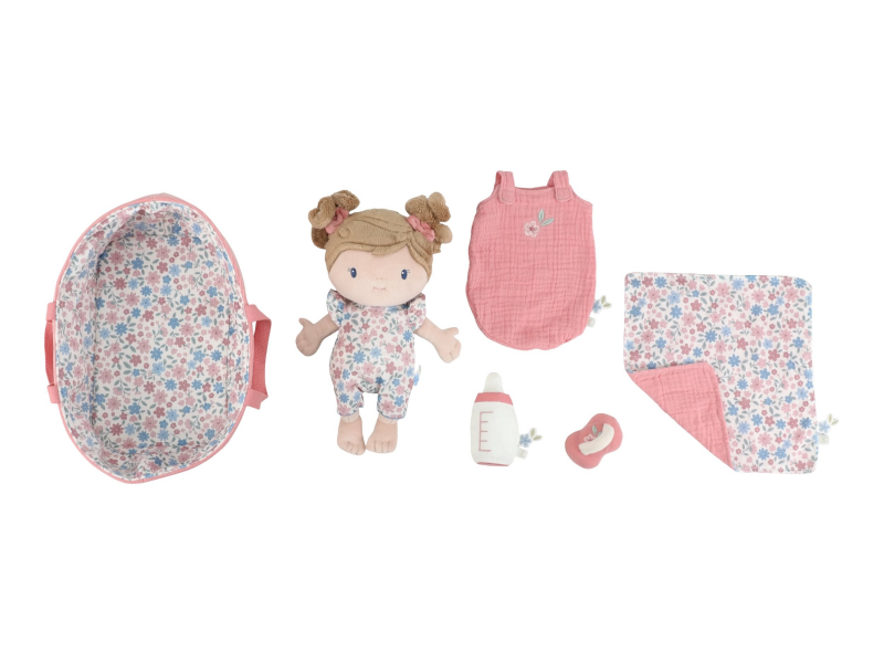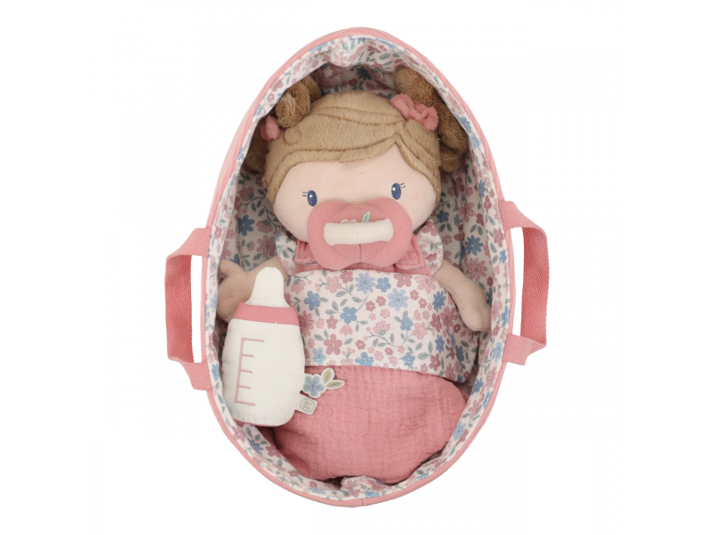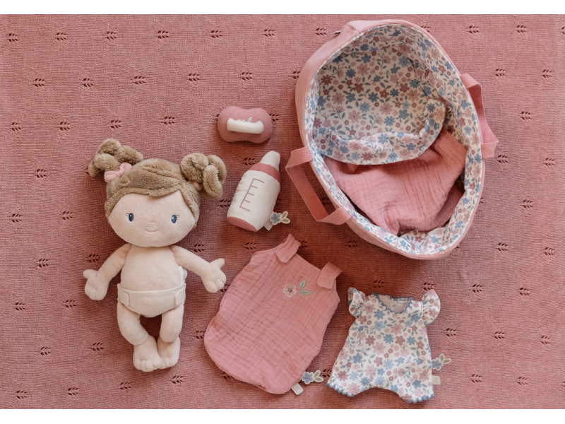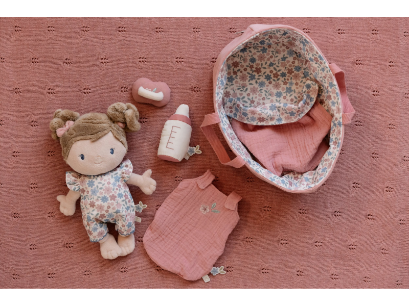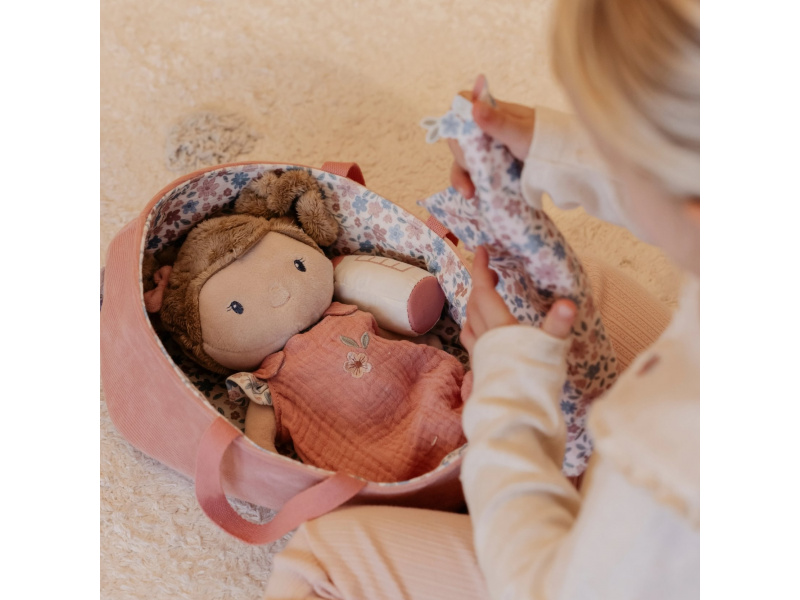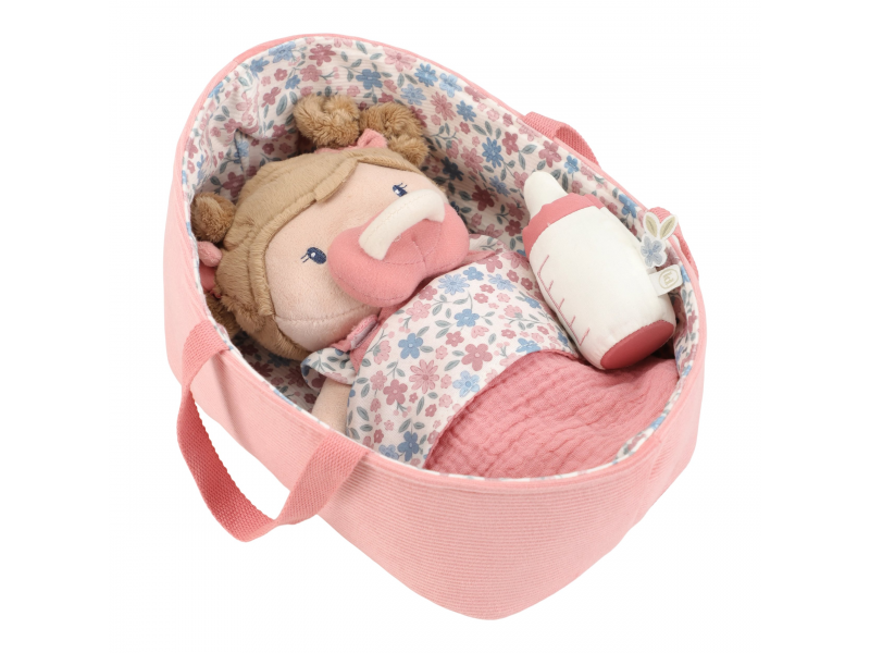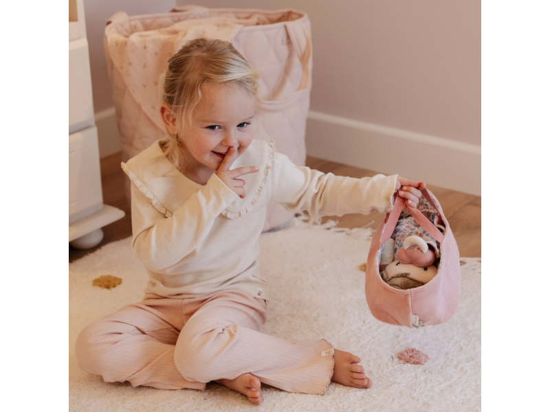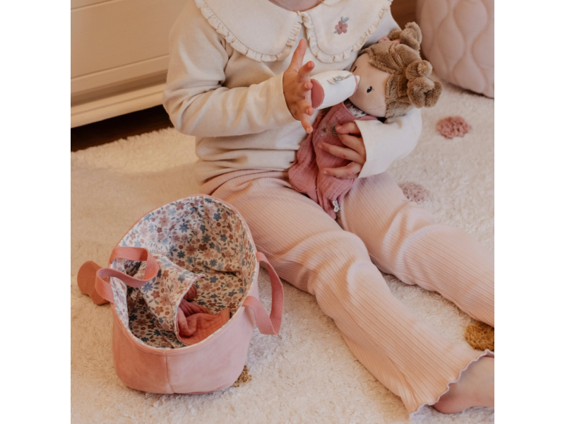 Něžná plyšová panenka Rosa se chce mazlit a chovat a díky praktickému košíku na spaní si ji můžete vzít kamkoli s sebou. Péče o takové miminko dá zabrat, a děti se tak hravou formou učí odpovědnosti. Rosu je potřeba pravidelně nakrmit nebo jí dát dudlík. Na spaní je potřeba Rosu uložit do spacího pytle a přikrýt dekou, aby jí nebyla zima. Výplň je vyrobena ze 100% recyklovaného polyesteru s certifikací GRS (Global Recycled Standard). Rozměry: 25 x 22 x 9 cm Složení: 50% polyester, 50% bavlna Možno prát v ruce. Vhodné pro děti od 12 měsíců.