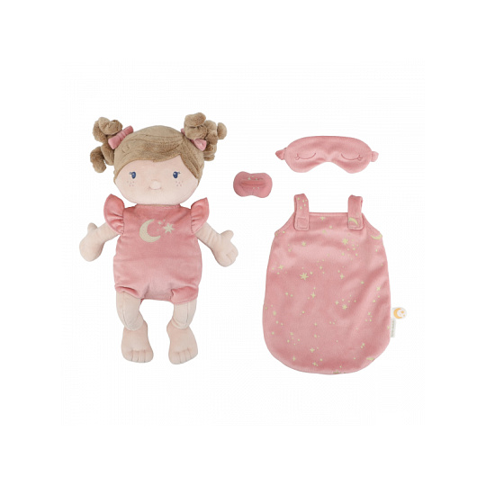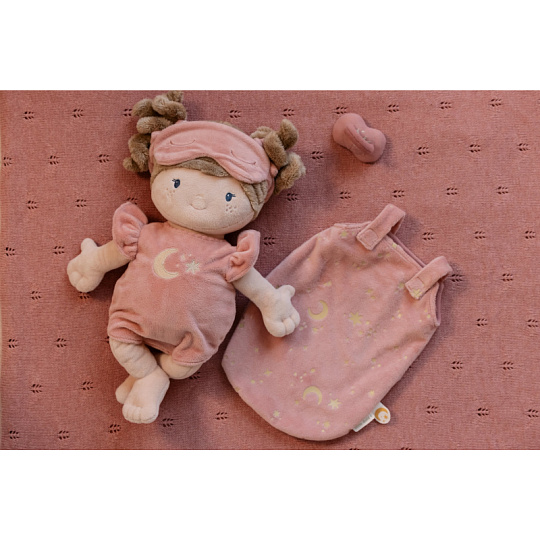 Něžná plyšová panenka Rosa z měkkého jemného materiálu je připravena na spaní, oblečena do pyžámka, vybavená plínkou, spacím pytlem, šidítkem i clonou na oči. Je vhodná na hraní i mazlení a bude se s ní i krásně usínat! Hvězdičky na spacím pytli v noci jemně světélkují, takže panenku v postýlce snadno najdete i v noci! Výplň je vyrobena ze 100% recyklovaného polyesteru s certifikací GRS (Global Recycled Standard). Rozměry: 37 x 22 x 10 cm Složení: 100% polyester Možno prát v ruce. Vhodné pro děti od 12 měsíců.