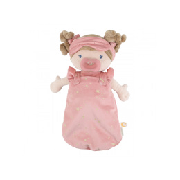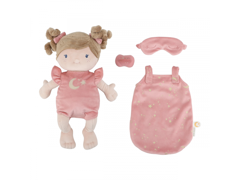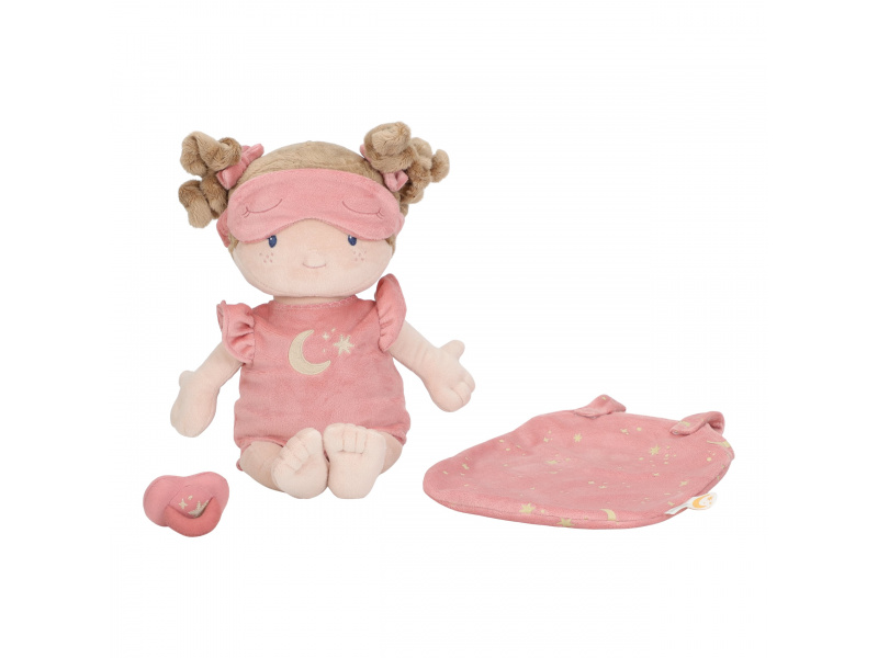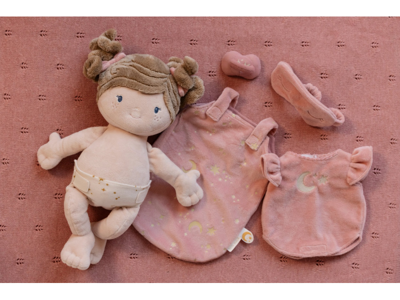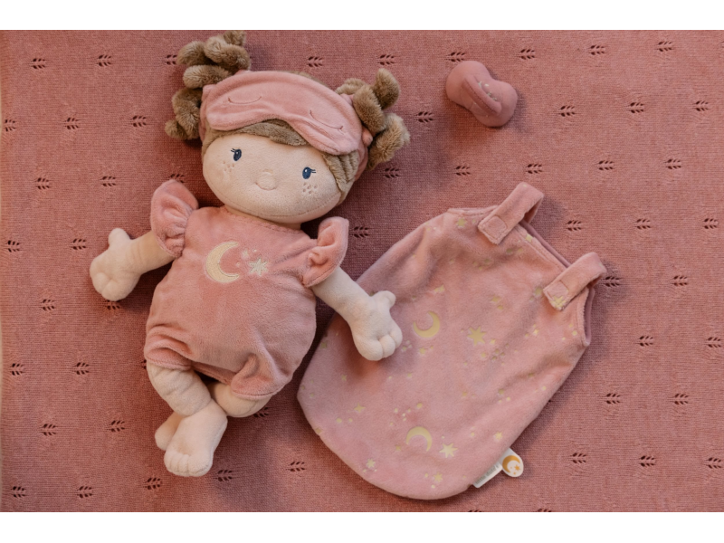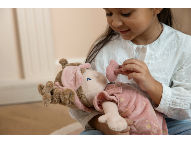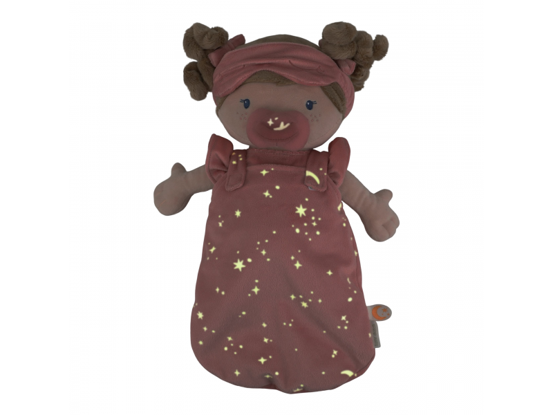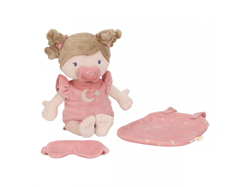 Něžná plyšová panenka Rosa z měkkého jemného materiálu je připravena na spaní, oblečena do pyžámka, vybavená plínkou, spacím pytlem, šidítkem i clonou na oči. Je vhodná na hraní i mazlení a bude se s ní i krásně usínat! Hvězdičky na spacím pytli v noci jemně světélkují, takže panenku v postýlce snadno najdete i v noci! Výplň je vyrobena ze 100% recyklovaného polyesteru s certifikací GRS (Global Recycled Standard). Rozměry: 37 x 22 x 10 cm Složení: 100% polyester Možno prát v ruce. Vhodné pro děti od 12 měsíců.