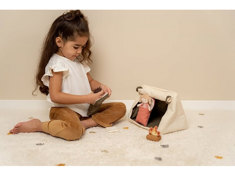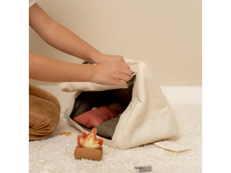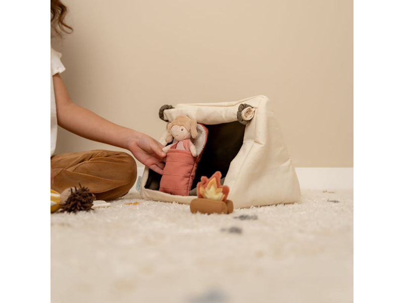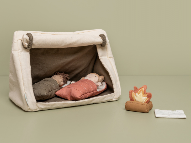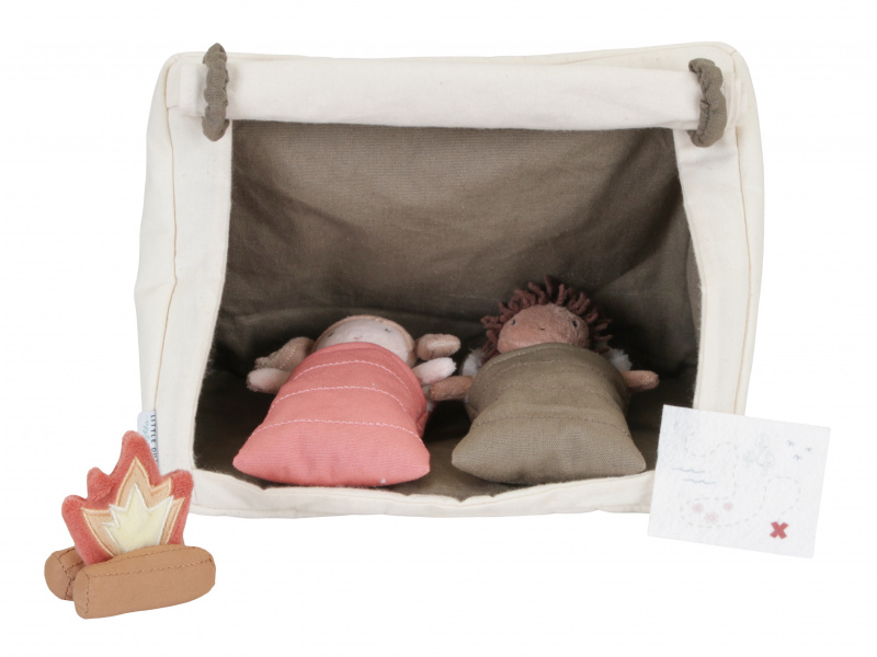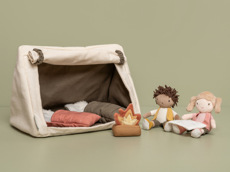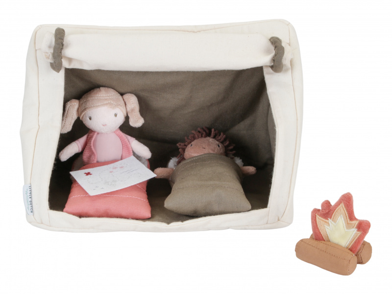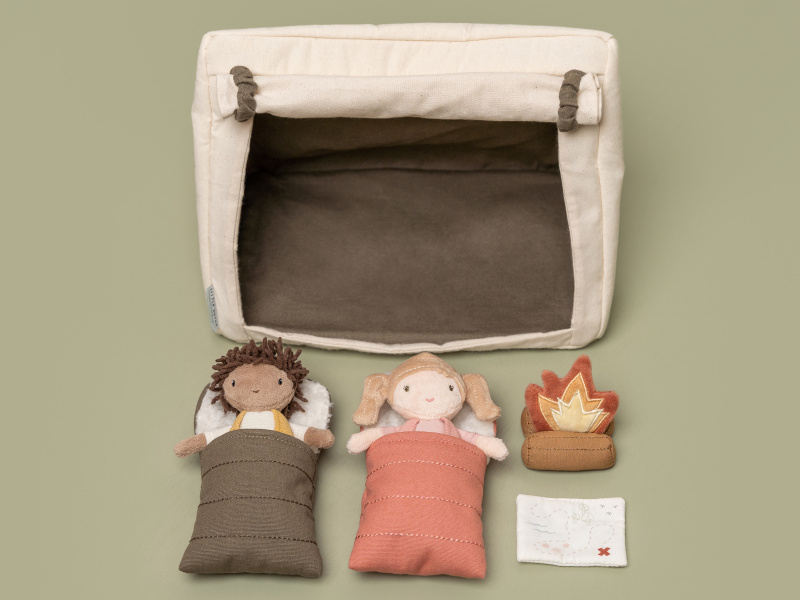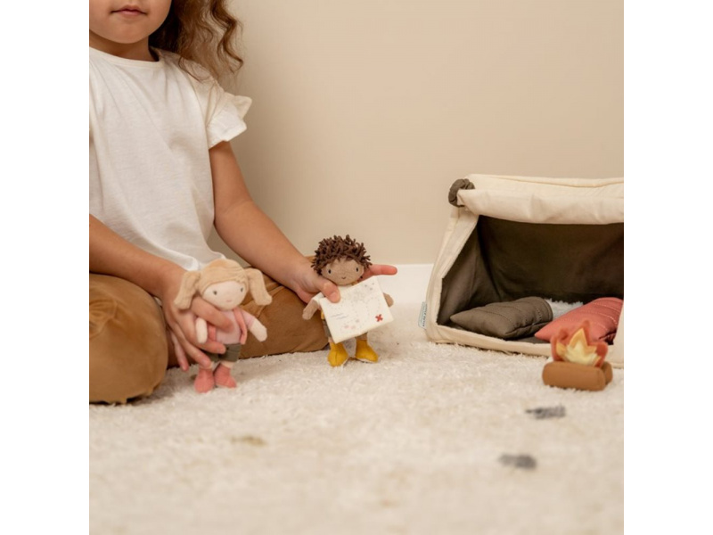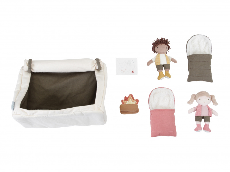 Originální sada s dvěma panenkami Annou a Jakem v krásném provedení z jemného plyšového materiálu. Anna a Jake vyrazili kempovat a mají vše, co k příjemnému pobytu v přírodě potřebují: pohodlný stan, spacáky, ohniště a mapu. Záleží už jen na fantazii vašeho dítěte, jaká cestovatelská dobrodružství pro ně vymyslí! Až hra skončí, snadno celou sadu zabalíte do tvaru pouzdra s držadlem. Díky svému provedení je sada vhodná i jako hračka na zabavení vašeho dítěte na cestách. Možno prát v pračce. Vhodné pro děti od 12 měsíců.