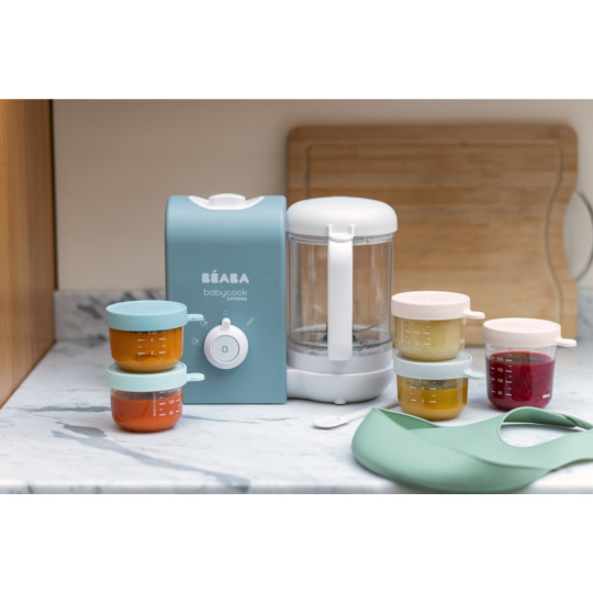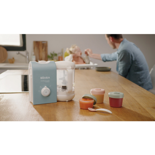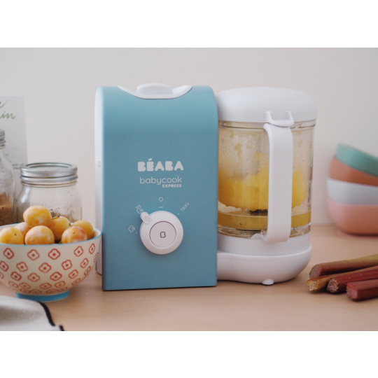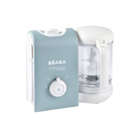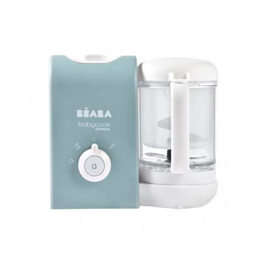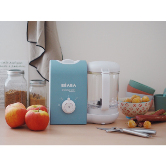 Skvělou pomoc při přípravě pokrmů pro děti představuje parní hrnec a mixér v jednom Beaba Babycook® Express. Babycook® umožňuje zdravě uvařit pokrm v páře a následně ho ve stejné nádobě rozmixovat. Zcela nový model Babycook® Express nabízí 2 režimy vaření v páře: Express režim pro úsporu času a Eco režim pro tradiční vaření. Zásobník na vodu s magnetickým víkem a vnitřní ryskou umožňuje díky velkému otvoru snadné plnění vodou. Příprava jídla v Babycooku je velmi snadná – pouze do něj nalijete vodu, do vkládacího košíku vložíte na kousky nakrájené suroviny (zeleninu, maso atd.) a přístroj zapnete. Po skončení vaření (trvá nejdéle 21 minut) se Babycook sám vypne. Chcete-li následně pokrm rozmixovat, pouze vysypete uvařené suroviny z vkládacího košíku do průhledné hlavní nádoby a rozmixujete (podle věku dítěte na jemnou hladkou kaši, nebo na hrubší strukturu s kousky). Když se dítě naučí dobře kousat, dá se Babycook® dále používat pro zdravé vaření v páře i bez mixování. Přístroj je možné použít i pro rozmrazování a ohřívání dětské stravy. Vnější plastová nádoba má objem 1250 ml, vkládací plastový košík má objem 1000 ml využitelný v režimu Eco. V režimu Express, který využívá při vaření míchací lopatku, je maximální využitelný objem 980 ml. Samostatně prodávaný nástavec umožňuje vařit v Babycooku i rýži nebo těstoviny. Nádobu, do které se vkládají potraviny, je možné mýt v myčce. Příkon: 400 W