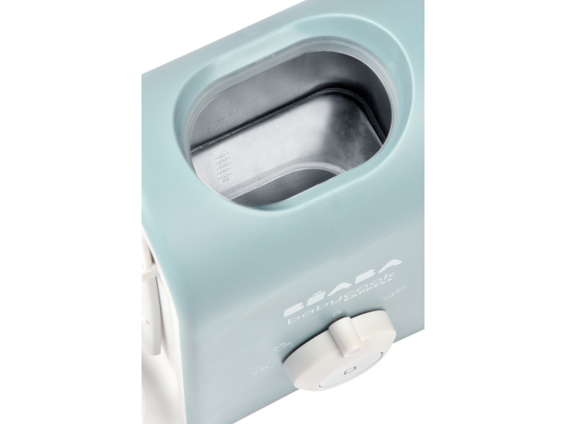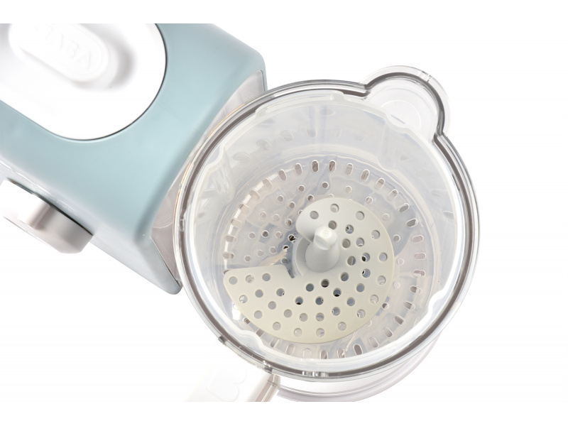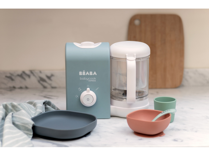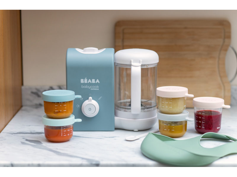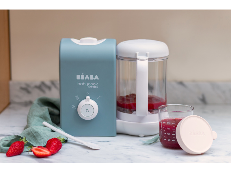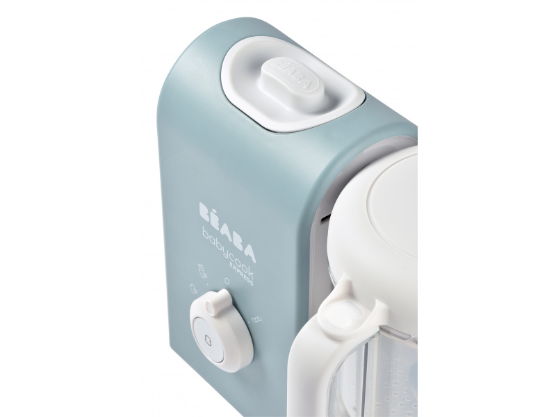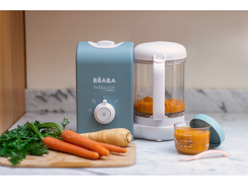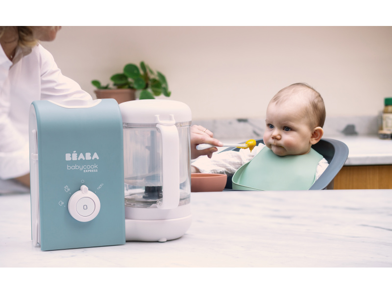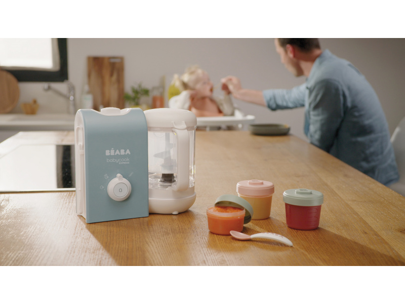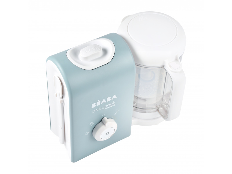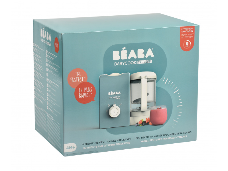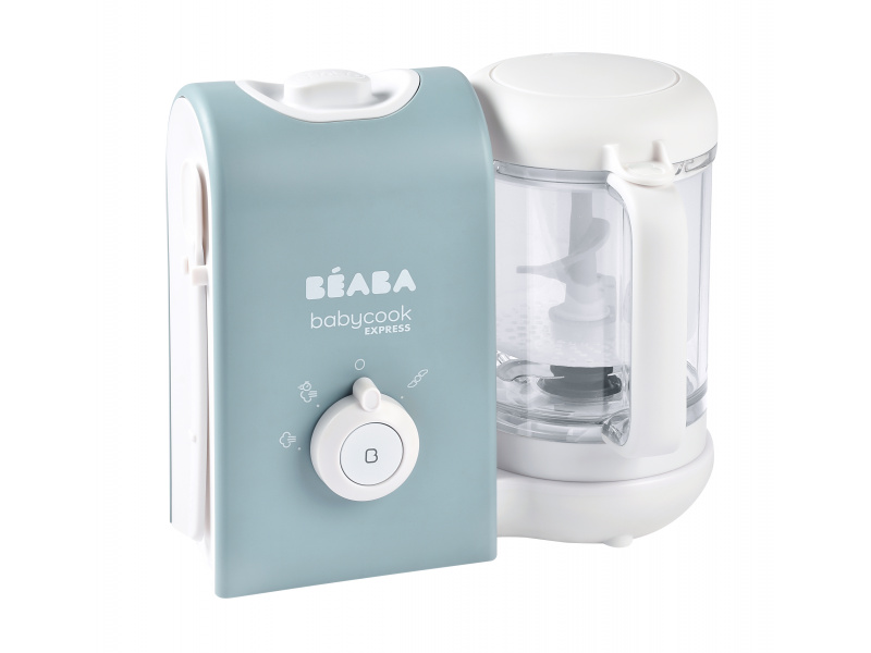 Skvělou pomoc při přípravě pokrmů pro děti představuje parní hrnec a mixér v jednom Beaba Babycook® Express. Babycook® umožňuje zdravě uvařit pokrm v páře a následně ho ve stejné nádobě rozmixovat. Zcela nový model Babycook® Express nabízí 2 režimy vaření v páře: Express režim pro úsporu času a Eco režim pro tradiční vaření. Zásobník na vodu s magnetickým víkem a vnitřní ryskou umožňuje díky velkému otvoru snadné plnění vodou. Příprava jídla v Babycooku je velmi snadná – pouze do něj nalijete vodu, do vkládacího košíku vložíte na kousky nakrájené suroviny (zeleninu, maso atd.) a přístroj zapnete. Po skončení vaření (trvá nejdéle 21 minut) se Babycook sám vypne. Chcete-li následně pokrm rozmixovat, pouze vysypete uvařené suroviny z vkládacího košíku do průhledné hlavní nádoby a rozmixujete (podle věku dítěte na jemnou hladkou kaši, nebo na hrubší strukturu s kousky). Když se dítě naučí dobře kousat, dá se Babycook® dále používat pro zdravé vaření v páře i bez mixování. Přístroj je možné použít i pro rozmrazování a ohřívání dětské stravy. Vnější plastová nádoba má objem 1250 ml, vkládací plastový košík má objem 1000 ml využitelný v režimu Eco. V režimu Express, který využívá při vaření míchací lopatku, je maximální využitelný objem 980 ml. Samostatně prodávaný nástavec umožňuje vařit v Babycooku i rýži nebo těstoviny. Nádobu, do které se vkládají potraviny, je možné mýt v myčce. Příkon: 400 W