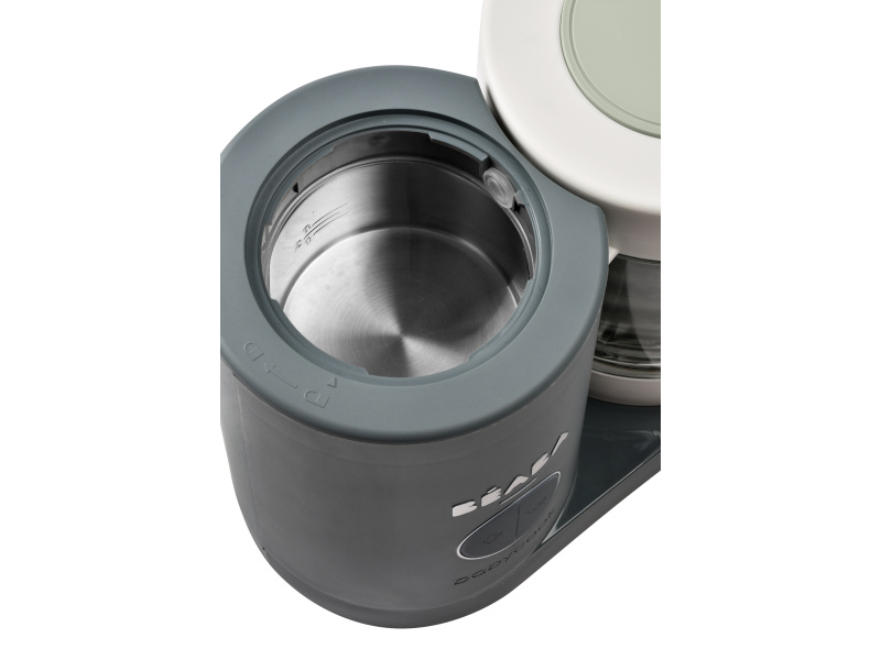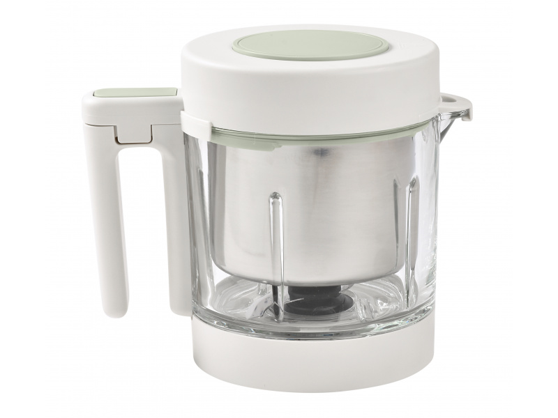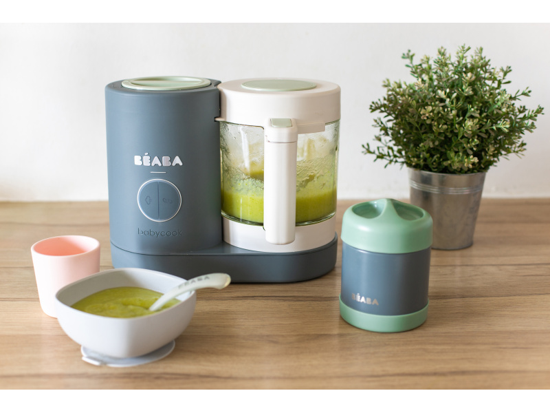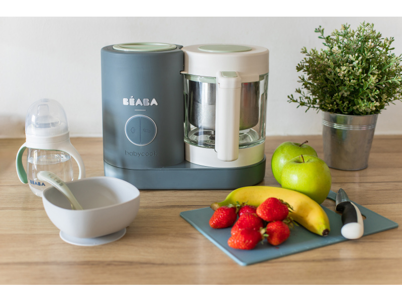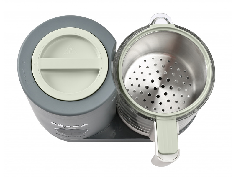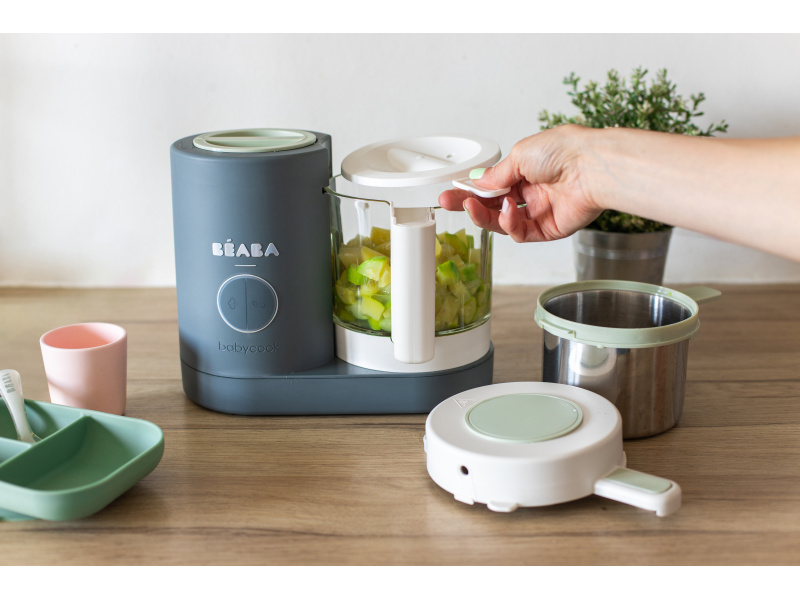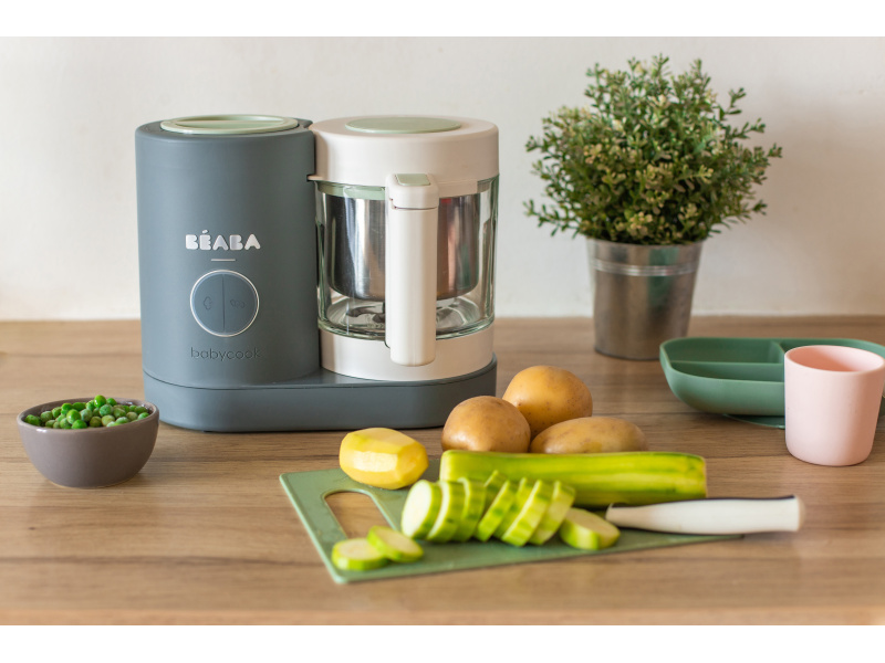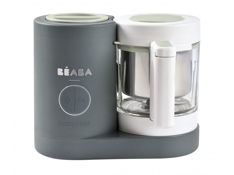 Skvělou pomoc při přípravě pokrmů pro děti představuje parní hrnec a mixér v jednom Babycook® Beaba. Babycook® umožňuje zdravě uvařit pokrm v páře a následně ho ve stejné nádobě rozmixovat. Zcela nový model Babycook® NEO má skleněnou nádobu s objemem 1250 ml a nerezový vkládací košík s objemem 1000 ml. Nerezový zásobník na vodu s vnitřní ryskou a se širokým vstupním otvorem usnadňuje plnění vodou i čištění zásobníku. Příprava jídla v Babycooku je velmi snadná – pouze do něj nalijete vodu, do vkládacího košíku vložíte na kousky nakrájené suroviny (zeleninu, maso atd.) a přístroj zapnete. Po skončení vaření (trvá nejdéle 15 min) se Babycook sám vypne. Chcete-li následně pokrm rozmixovat, pouze vysypete uvařené suroviny z vkládacího košíku do průhledné hlavní nádoby a rozmixujete (podle věku dítěte na jemnou hladkou kaši, nebo na hrubší strukturu s kousky). Když se dítě naučí dobře kousat, dá se Babycook® dále používat pro zdravé vaření v páře i bez mixování. Přístroj je možné použít i pro rozmrazování a ohřívání dětské stravy. Příkon: 400 W