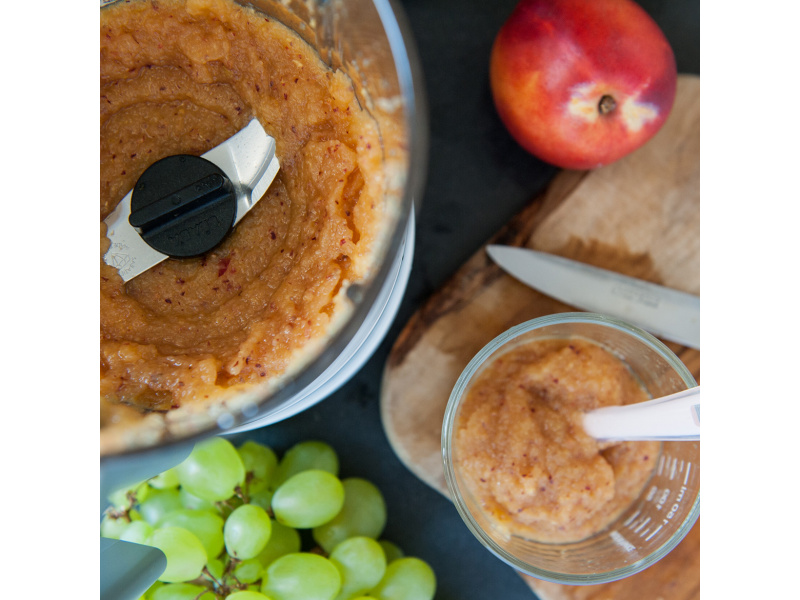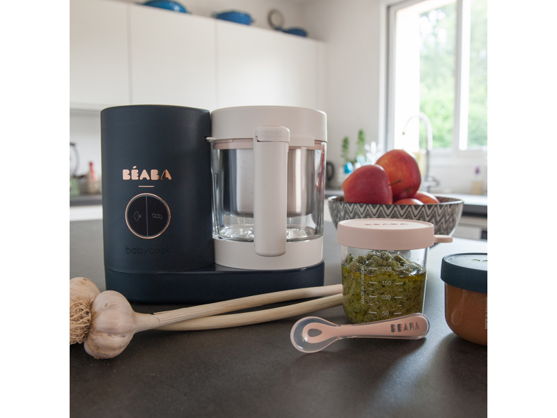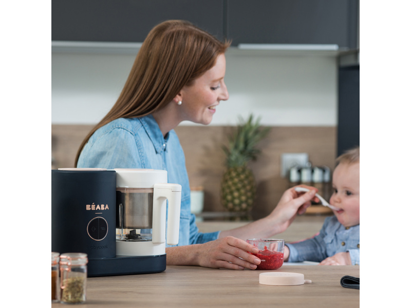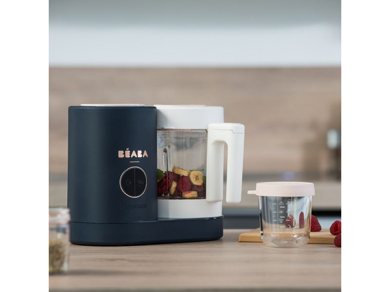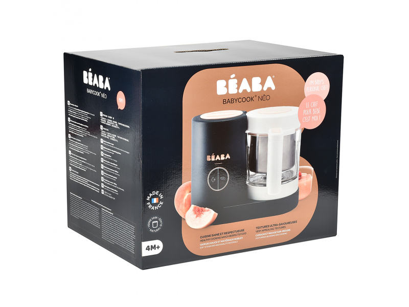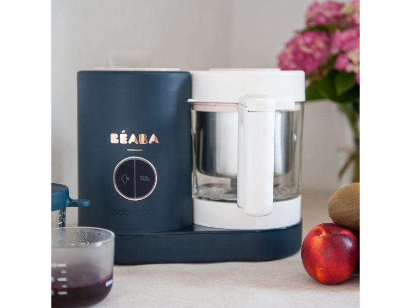 Skvělou pomoc při přípravě pokrmů pro děti představuje parní hrnec a mixér v jednom Babycook® Beaba. Babycook® umožňuje zdravě uvařit pokrm v páře a následně ho ve stejné nádobě rozmixovat. Zcela nový model Babycook® NEO má skleněnou nádobu s objemem 1250 ml a nerezový vkládací košík s objemem 1000 ml. Nerezový zásobník na vodu s vnitřní ryskou a se širokým vstupním otvorem usnadňuje plnění vodou i čištění zásobníku. Příprava jídla v Babycooku je velmi snadná – pouze do něj nalijete vodu, do vkládacího košíku vložíte na kousky nakrájené suroviny (zeleninu, maso atd.) a přístroj zapnete. Po skončení vaření (trvá nejdéle 15 min) se Babycook sám vypne. Chcete-li následně pokrm rozmixovat, pouze vysypete uvařené suroviny z vkládacího košíku do průhledné hlavní nádoby a rozmixujete (podle věku dítěte na jemnou hladkou kaši, nebo na hrubší strukturu s kousky). Když se dítě naučí dobře kousat, dá se Babycook® dále používat pro zdravé vaření v páře i bez mixování. Přístroj je možné použít i pro rozmrazování a ohřívání dětské stravy. Příkon: 400 W