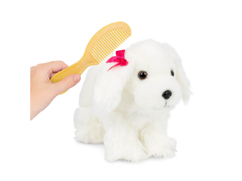 Roztomilé plyšové štěně v kabelce s krásným potiskem je vždy připravené na mazlení i na procházku. Miluje vyčesávání své hebké srsti hřebínkem a díky kabelce si jej vaše dítě může vzít kamkoli. Kabelka má průhlednou přední stěnu ze síťoviny s otevíráním na zip, aby štěňátko při přenášení vidělo na svět. Obsah balení: kabelka, plyšové štěně, hřeben Rozměry: cca 20 x 15 x 23 cm Vhodné pro děti od 3 let.