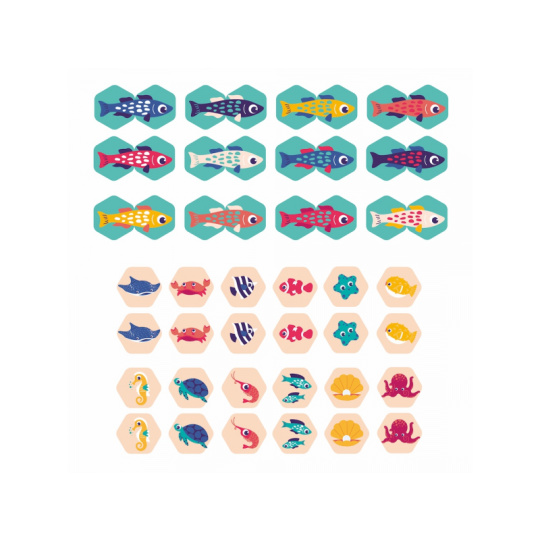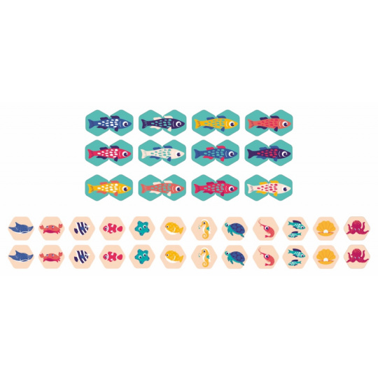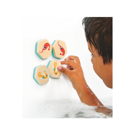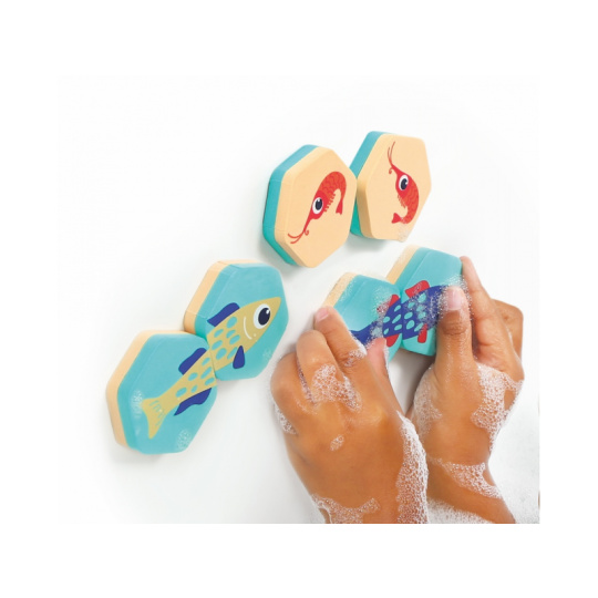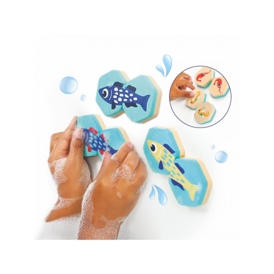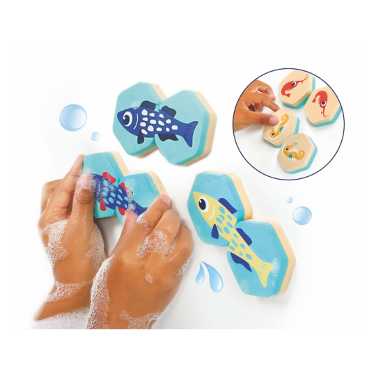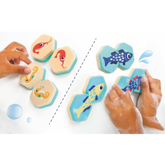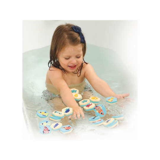 Pexeso pro nejmenší s krásnými motivy z podmořského světa vám umožní zahrát si s vaším dítětem pexeso ve vaně. Kartičky jsou vyrobené z pěnového materiálu, který plave na hladině. Stačí je rozložit na hladinu a hra může začít. Oboustranné kartičky nabízí dvě varianty hry - klasické pexeso a jednoduchá puzzle hra, při které dítě hledá dva díly, které spolu tvoří barevnou rybičku. Vyhrané dvojice i složené rybičky si dítě může nalepit na stěnu vany. Pexeso je dodáváno v praktické dóza, do které jej po skončení koupele snadno uložíte. Složení: 100% EVA Vhodné pro děti od 18 měsíců.