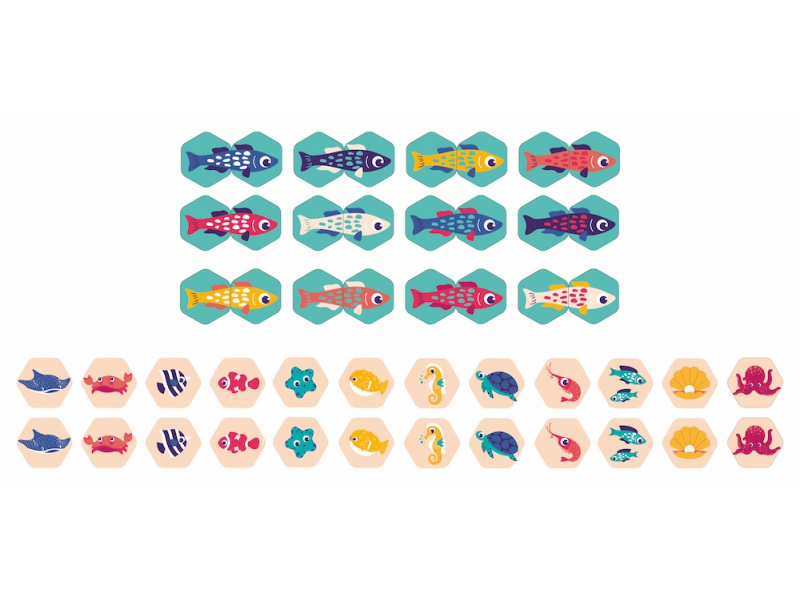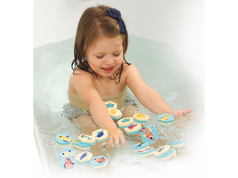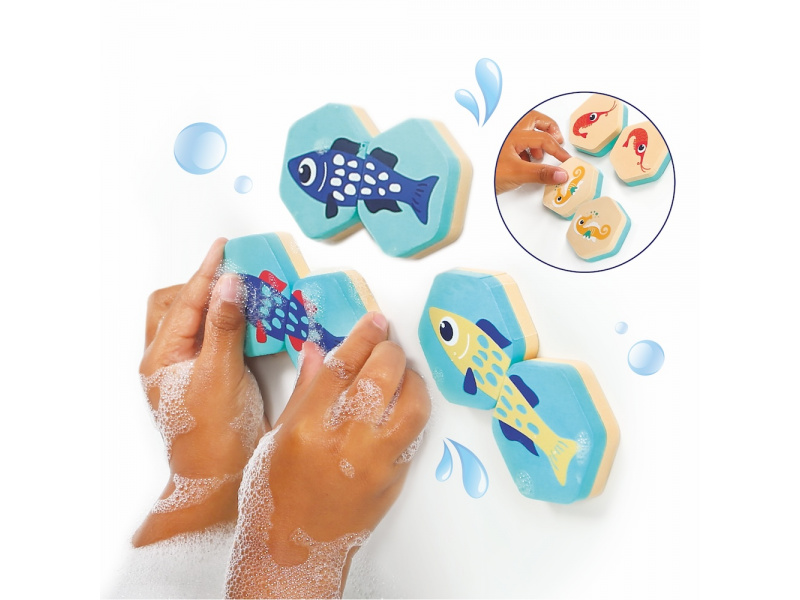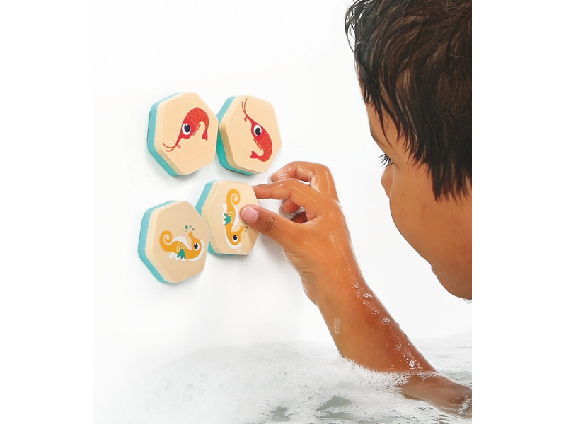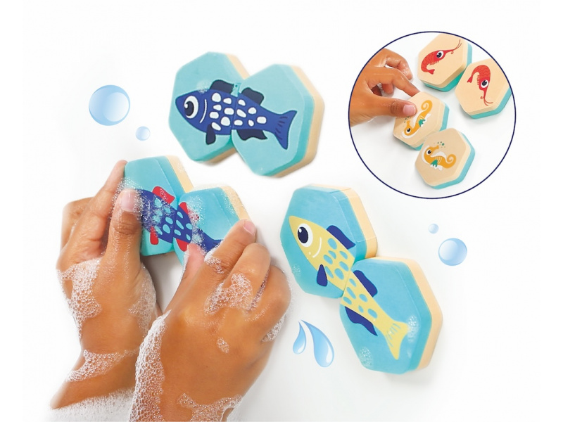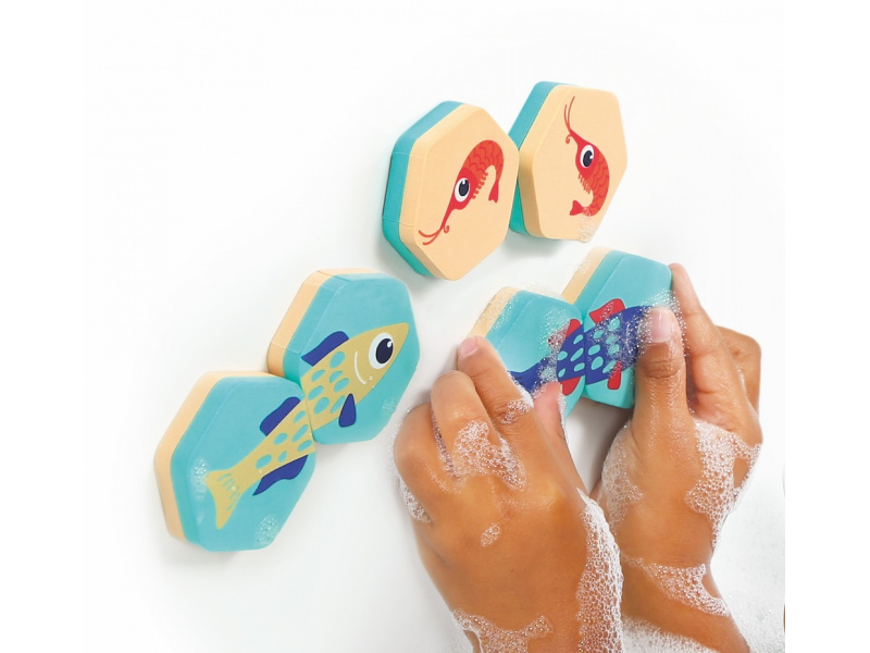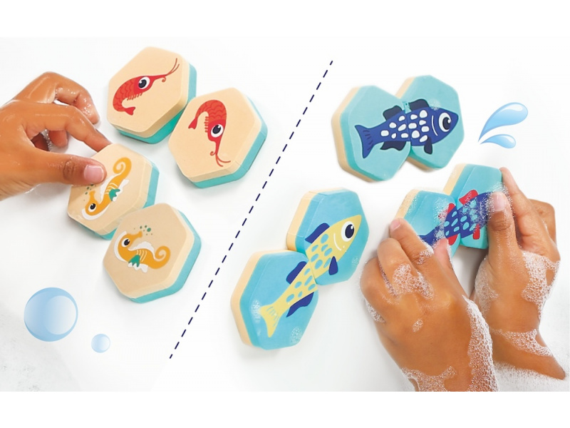Pexeso pro nejmenší s krásnými motivy z podmořského světa vám umožní zahrát si s vaším dítětem pexeso ve vaně. Kartičky jsou vyrobené z pěnového materiálu, který plave na hladině. Stačí je rozložit na hladinu a hra může začít. Oboustranné kartičky nabízí dvě varianty hry - klasické pexeso a jednoduchá puzzle hra, při které dítě hledá dva díly, které spolu tvoří barevnou rybičku. Vyhrané dvojice i složené rybičky si dítě může nalepit na stěnu vany. Pexeso je dodáváno v praktické dóza, do které jej po skončení koupele snadno uložíte. Složení: 100% EVA Vhodné pro děti od 18 měsíců.