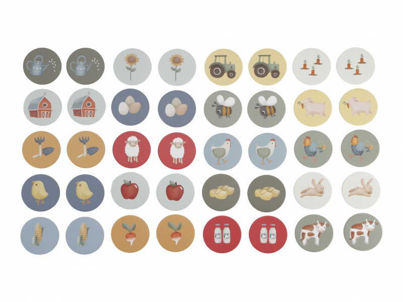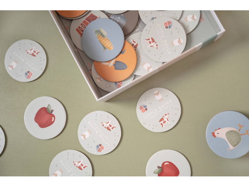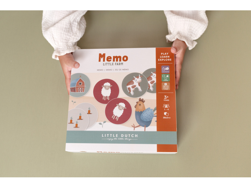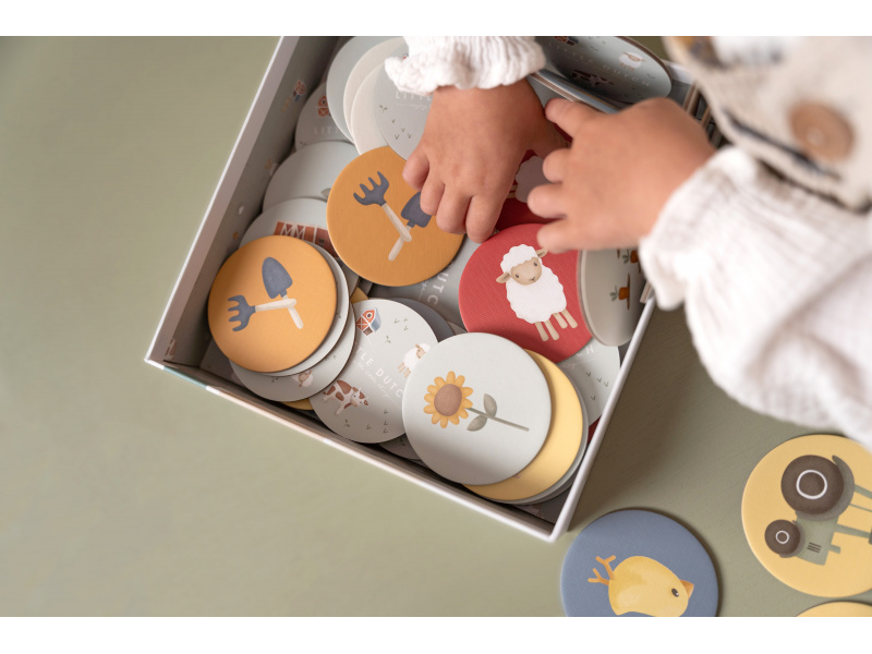 Pexeso pro nejmenší z pevného kartonu s obrázky inspirovanými životem na farmě. Zábavná hra pomáhá procvičovat soustředění a paměť vašeho dítěte. Hra je součástí designové kolekce hraček a doplňků Little Dutch Farma. Balení obsahuje 2 x 20 karet. Rozměry boxu: 21,5 x 21,5 x 5,2 cm Vhodné pro děti od 3 let.