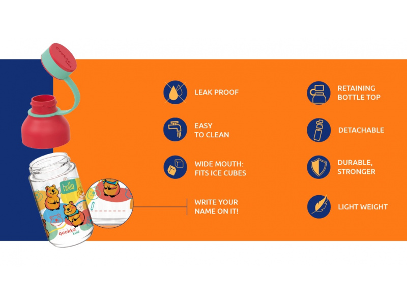 Dětská láhev Quokka Ice Kids s dvojitým otevíráním umožňuje vložení kostek ledu či kousků ovoce a zároveň se snadno čistí. 100% těsnicí, šroubovací uzávěry chrání obsah láhve před vylitím. Poutko usnadňuje přenášení a zároveň chrání uzávěr před ztracením. Na spodní části láhve je prostor pro napsání jména nebo nakreslení obrázku, aby nedošlo k záměně ve školce či ve škole. Objem: 430 ml Rozměry: 175 x 68,5 mm Vysoce kvalitní a odolný plast neobsahuje BPA. Láhev není vhodná do myčky ani mikrovlnné trouby.