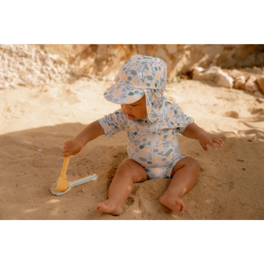 Čepička z UV ochranné tkaniny s krásným potiskem chrání vaše dítě před sluncem při koupání u moře i doma na zahradě. Ať už vaše děti milují skákání ve vlnách, koupání v bazénu nebo si rády staví hrady z písku, s touto čepičkou si mohou bezstarostně užívat celý den. Velikost 1 je určena pro děti od narození do cca 1 roku. Složení: 82% recyklovaný polyester, 18% elastan Ochranný faktor: UPF 50+ Při pobytu na slunci používejte pro dítě ochranné opalovací krémy. Možno prát v pračce na 30°C. Po každém použití čepičku propláchněte v čisté studené vodě.