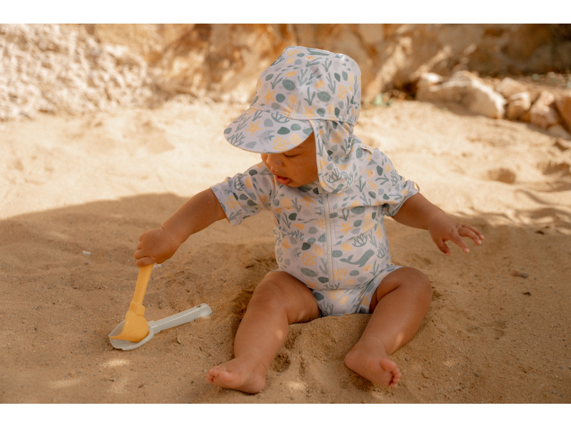 Čepička z UV ochranné tkaniny s krásným potiskem chrání vaše dítě před sluncem při koupání u moře i doma na zahradě. Ať už vaše děti milují skákání ve vlnách, koupání v bazénu nebo si rády staví hrady z písku, s touto čepičkou si mohou bezstarostně užívat celý den. Velikost 1 je určena pro děti od narození do cca 1 roku. Složení: 82% recyklovaný polyester, 18% elastan Ochranný faktor: UPF 50+ Při pobytu na slunci používejte pro dítě ochranné opalovací krémy. Možno prát v pračce na 30°C. Po každém použití čepičku propláchněte v čisté studené vodě.