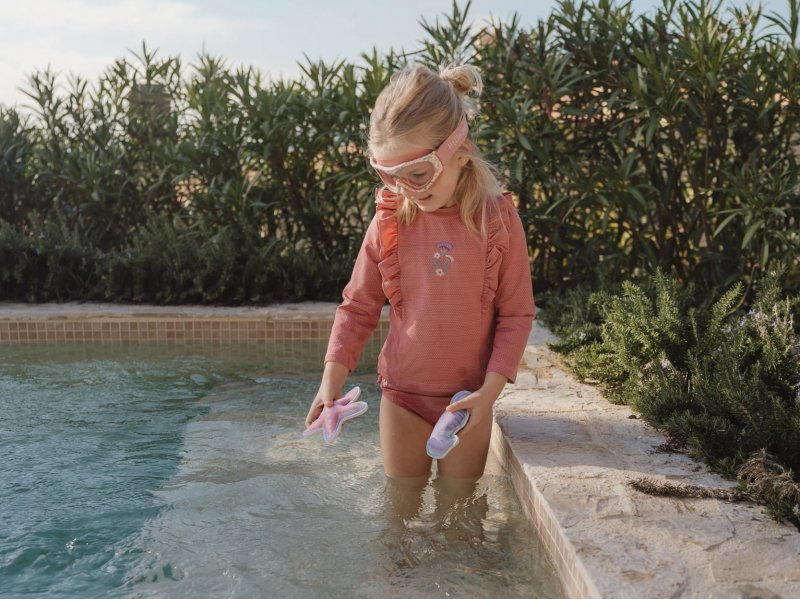 Plavky z UV ochranné tkaniny s krásnou výšivkou chrání vaše dítě před sluncem při koupání u moře i doma na zahradě. Ať už vaše děti milují skákání ve vlnách, koupání v bazénu nebo si rády staví hrady z písku, v těchto plavkách si mohou bezstarostně užívat celý den. Složení: 77% recyklovaný nylon, 9% polyester, 6% kovové vlákno, 8% elastan Ochranný faktor: UPF 40+ Při pobytu na slunci používejte pro dítě ochranné opalovací krémy. Možno prát v pračce na 30°C. Po každém použití plavky propláchněte v čisté studené vodě.