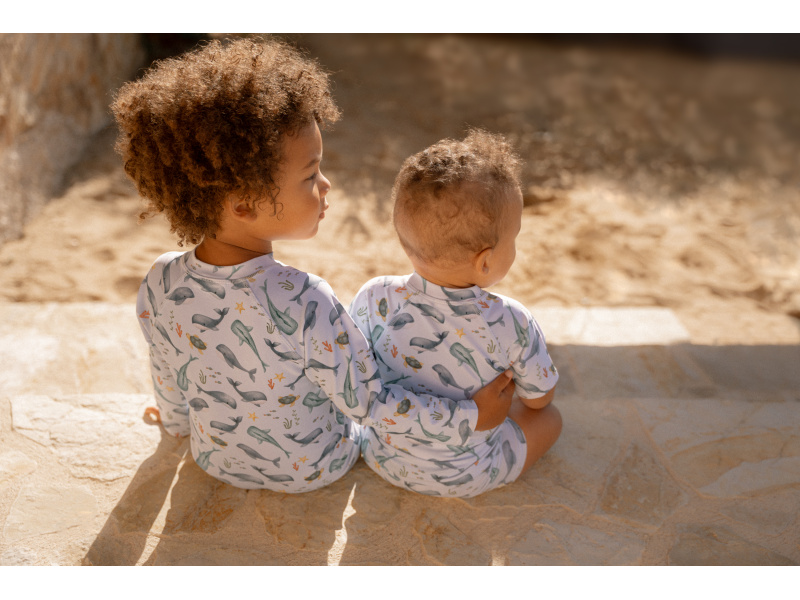 Plavky z UV ochranné tkaniny s krásným potiskem chrání vaše dítě před sluncem při koupání u moře i doma na zahradě. Ať už vaše děti milují skákání ve vlnách, koupání v bazénu nebo si rády staví hrady z písku, v těchto plavkách si mohou bezstarostně užívat celý den. Složení: 82% recyklovaný polyester, 18% elastan Ochranný faktor: UPF 50+ Při pobytu na slunci používejte pro dítě ochranné opalovací krémy. Možno prát v pračce na 30°C. Po každém použití plavky propláchněte v čisté studené vodě.