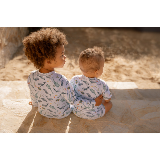 Plavky z UV ochranné tkaniny s krásným potiskem chrání vaše dítě před sluncem při koupání u moře i doma na zahradě. Ať už vaše děti milují skákání ve vlnách, koupání v bazénu nebo si rády staví hrady z písku, v těchto plavkách si mohou bezstarostně užívat celý den. Složení: 82% recyklovaný polyester, 18% elastan Ochranný faktor: UPF 50+ Při pobytu na slunci používejte pro dítě ochranné opalovací krémy. Možno prát v pračce na 30°C. Po každém použití plavky propláchněte v čisté studené vodě.