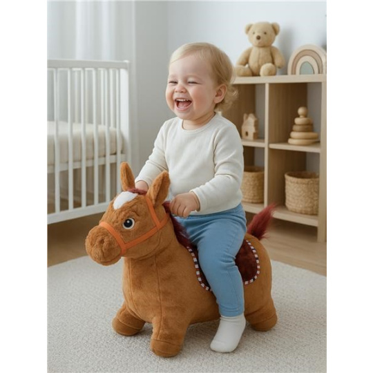 Skákadlo je potaženo měkkým, protiskluzovým plyšem, velmi příjemným na dotek. Je vybaveno zvukovým modulem – po stisknutí mezi oušky vydává realistický zvuk koníka, což podporuje představivost a motivuje k aktivní hře.