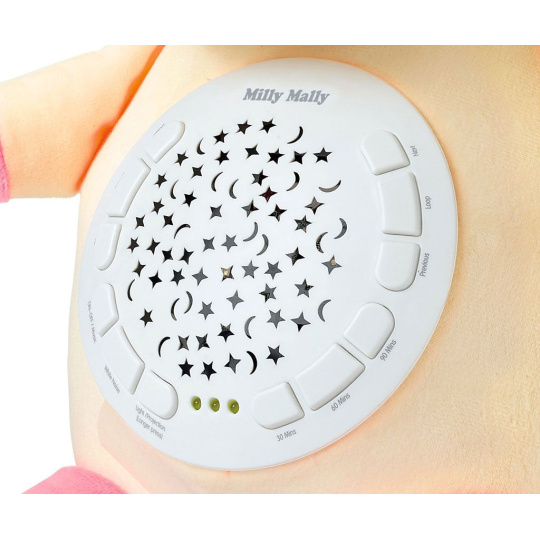 Můžete nastavit vhodnou dobu trvání: 30, 60, 90 minut. K dispozici je 5 úrovní hlasitosti. Skvělým doplňkem jeho funkce je 5 druhů bílého šumu, který má na batole obzvláště uklidňující účinek umožňující mu zklidnit se a rychleji usnout. S touto hračkou uslyšíte jemné zvuky: zurčení vody se zvuky ptáků, tlukot srdce, kapání vody, zpěv ptáků nebo padající déšť.
