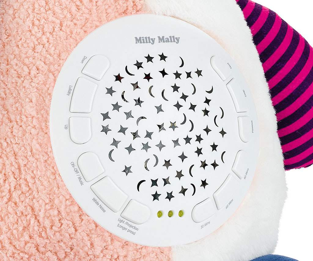 Můžete nastavit vhodnou dobu trvání: 30, 60, 90 minut. K dispozici je 5 úrovní hlasitosti. Skvělým doplňkem jeho funkce je 5 druhů bílého šumu, který má na batole obzvláště uklidňující účinek umožňující mu zklidnit se a rychleji usnout. S touto hračkou uslyšíte jemné zvuky: zurčení vody se zvuky ptáků, tlukot srdce, kapání vody, zpěv ptáků nebo padající déšť.