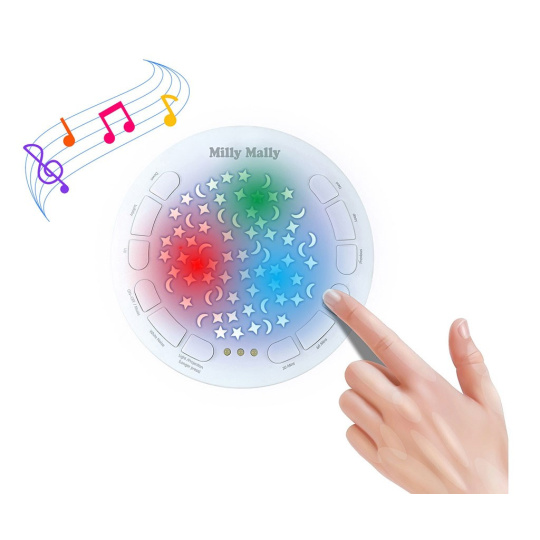 Můžete nastavit vhodnou dobu trvání: 30, 60, 90 minut. K dispozici je 5 úrovní hlasitosti. Skvělým doplňkem jeho funkce je 5 druhů bílého šumu, který má na batole obzvláště uklidňující účinek umožňující mu zklidnit se a rychleji usnout. S touto hračkou uslyšíte jemné zvuky: zurčení vody se zvuky ptáků, tlukot srdce, kapání vody, zpěv ptáků nebo padající déšť.