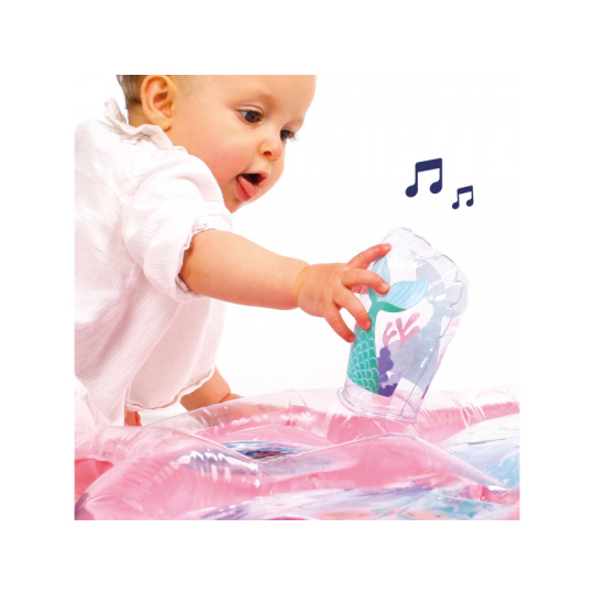 Interaktivní podložka na hraní naplněná vodou připomíná skutečný podmořský svět s vodními živočichy. Figurky mořských tvorů se uvnitř ve vodě začnou pohybovat, kdykoli dítě na podložku sáhne rukou. Jednotlivé části podložky jsou propojené, takže když se dítě o podložku opře, voda proudí mezi jednotlivými částmi. Na nafukovacích okrajích jsou umístěna dvě nafukovací madla, která při zmáčknutí pískají a cinkají. Podložka je ideální pro hru na bříšku, která je důležitá pro správný vývoj dítěte. Hraní na podložce působí na všechny dětské smysly, učí dítě příčině a následku a pomáhá rozvíjet jeho motorické dovednosti. Použití podložky je velmi jednoduché, stačí ji nafouknout a naplnit vodou. Když hračku nepoužíváte, snadno ji opět vyfouknete a vodu vylejete. Rozměr podložky: 94 x 20 x 63 cm Vhodné pro děti od 10 měsíců.