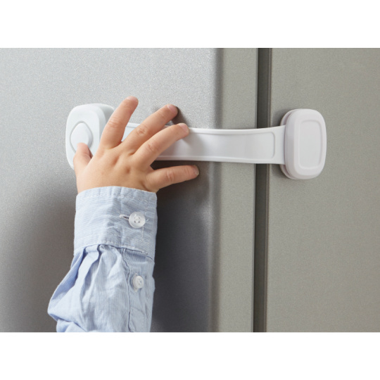 Samolepicí pojistka brání dětem dostat se do skříněk s dvířky, do lednice apod. Pojistku snadno instalujete na dveře a bok skříňky bez nutnosti vrtání. Dospělý dokáže pojistku snadno otevřít díky "neviditelnému" způsobu otevírání - zámek pojistky je vyroben z pružného materiálu a otevírá se současným zmáčknutím jednou rukou z horní a spodní strany zámku. Velké tlačítko na přední straně zámku není funkční, pouze slouží k odlákání pozornosti dítěte, které se bude snažit tlačítko mačkat, ale zámek s jeho pomocí otevřít nelze. Když děti vyrostou, pojistku snadno odstraníte. Vhodné pro použití od 6 měsíců.