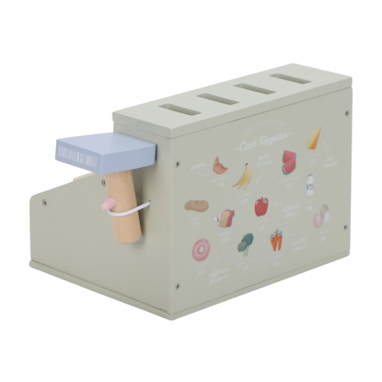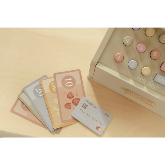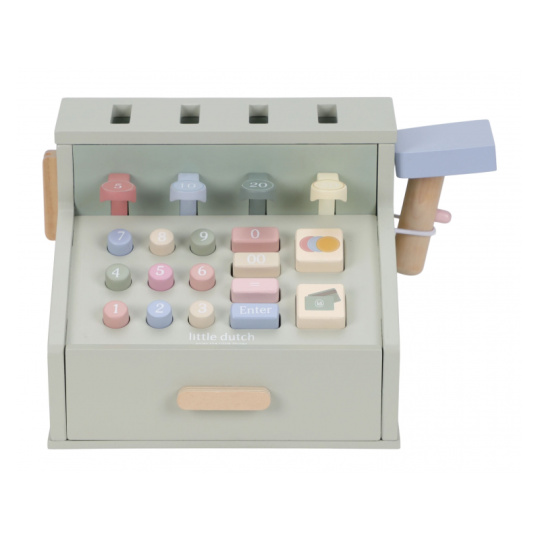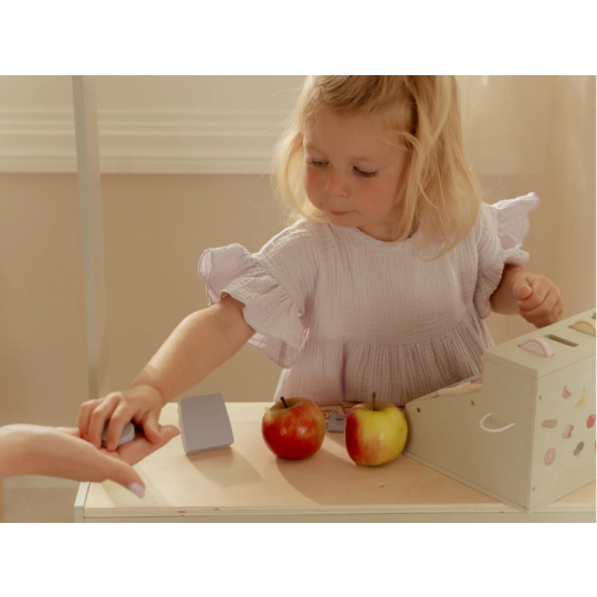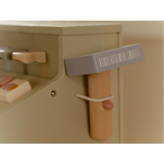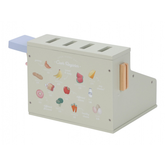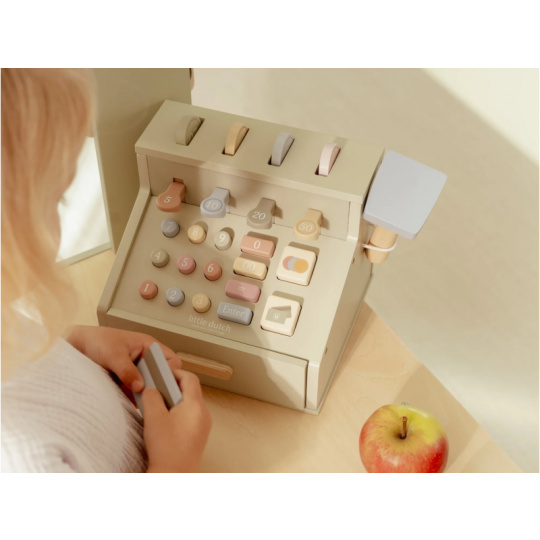 Počítej, skenuj a markuj! S touto krásnou dřevěnou pokladnou bude hra na obchod ještě zábavnější a realističtější. Pokladna je vybavena skenerem, čtečkou karet, tlačítky a zásuvkou na mince a bankovky. Součástí je i platební karta, takže malí prodavači mohou přijímat hotovost i bezkontaktní platby. Děti si mohou procvičit základní počty a rozvíjet finanční gramotnost hrou, zatímco obsluhují zákazníky, skenují zboží a vystavují účtenky. Ideální doplněk k dalším dřevěným herním sadám, jako je kávovar, čajová souprava nebo dětský obchůdek. Hračka je součástí kolekce vysoce kvalitních dřevěných hraček Little Dutch, navržených s důrazem na bezpečnost a originální design. Vyrobeno z odolného FSC certifikovaného dřeva. Rozměry: 23 x 16,5 x 14,5 cm Vhodné pro děti od 3 let.