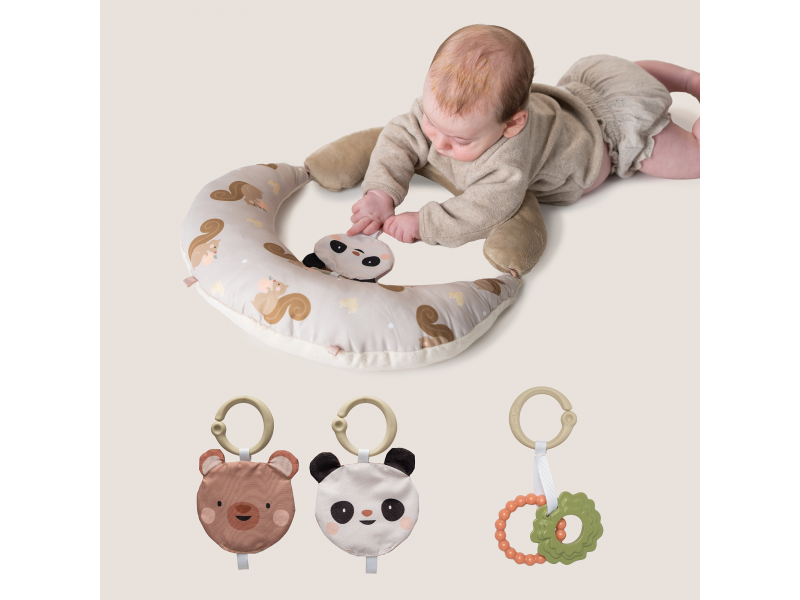 Polštářek z měkkého, příjemného materiálu je speciálně navržený, aby podporoval hraní dítěte na bříšku. Pro malého kojence, který tráví většinu dne i noci ležením na zádech, je důležité, aby trávil několikrát denně čas ležením na bříšku a takzvaným “pasením koníčků”. Poloha na bříšku přináší děťátku jiný pohled na svět a posiluje krční a zádové svaly, které později umožňují dítěti začít se přetáčet, lézt a sedět bez opory. Provedení 2v1 nabízí dvě velikosti pro dvě věková stádia dítěte: Měkčí a nižší polštářek pro děti od narození do 2 měsíců ve tvaru "U" jemně podpírá lokty miminka, pomáhá mu zvedat hlavičku a podporuje vizuální soustředění a sledování Větší a pevnější polštářek pro děti od 2 do 6 měsíců podpírá hrudník dítěte a ponechává mu volné ruce - ideální pro natahování se po hračkách, smyslové objevování a první pokusy o plazení Vývojové benefity Posiluje základní svaly od narození – krk, ramena, záda i střed těla Podporuje vizuální soustředění díky kontrastním a barevným ilustracím Stimuluje smysly – hmat, zrak i sluch – díky kousátku, kroužku a šusticím prvkům Rozvíjí jemnou motoriku, koordinaci ruka–oko a dovednosti, které budou potřeba pro další milníky, jako je plazení, sezení a samostatné krmení Balení obsahuje polštářek pro hru na bříšku, oboustrannou šusticí hračku a kousátko s kroužky. Vhodné pro děti od narození.