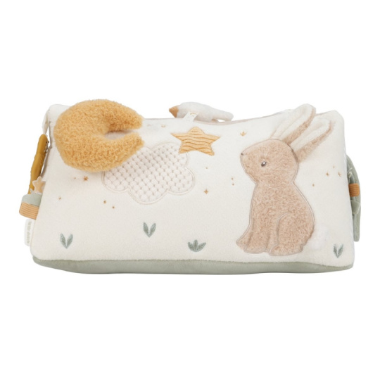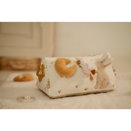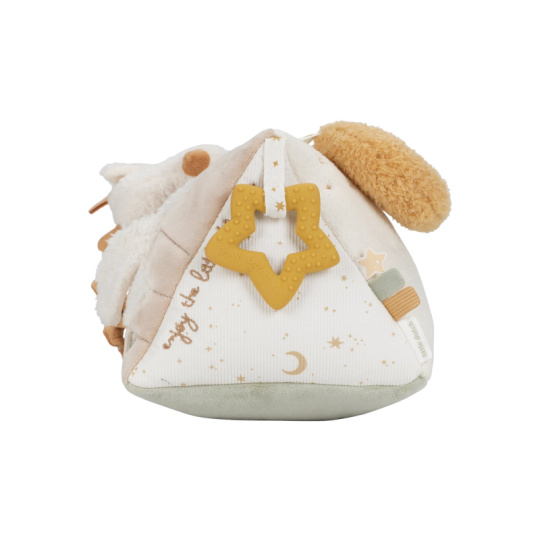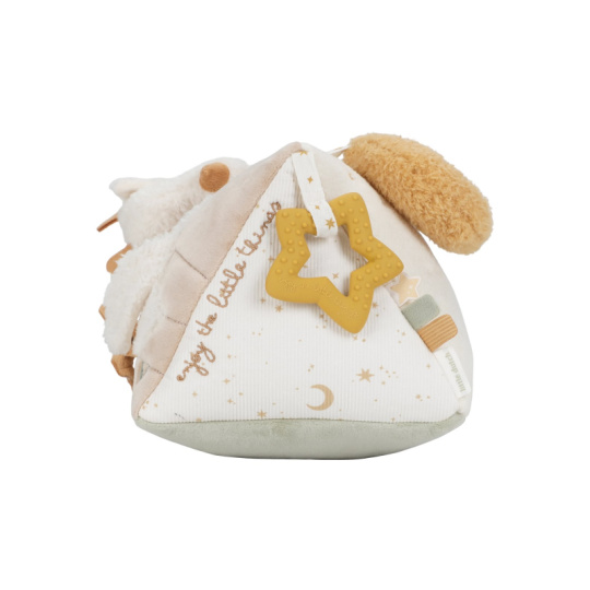 Dotýkej se, hraj si a objevuj! Tento měkký trojhranný polštářek nabízí vašemu miminku spoustu vjemů a zábavy. Různé textury, jemné zvuky a roztomilé detaily podněcují smyslový vývoj a motivují ke zkoumání. Smyslová stimulace a první objevování: Různé struktury látek a materiálů stimulují hmat a zvědavost Jemné zvuky, šustění a drobné prvky povzbuzují sluch a pozorování Ideální pro první uchopování, mačkání a přetáčení v rukách Praktický tvar a design: Lehký a snadno uchopitelný tvar trojúhelníku – padne do malých ruček Přírodní barvy a měkký materiál ladí do každého pokojíčku Ideální na hrací deku Rozměry: 35 × 18 × 18 cm Složení: 100 % polyester Výplň je vyrobena ze 100% recyklovaného polyesteru s certifikací GRS (Global Recycled Standard). Možno prát v ruce při 30°C. Vhodné pro děti od narození.
