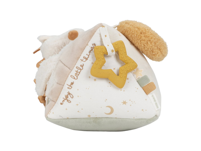 Dotýkej se, hraj si a objevuj! Tento měkký trojhranný polštářek nabízí vašemu miminku spoustu vjemů a zábavy. Různé textury, jemné zvuky a roztomilé detaily podněcují smyslový vývoj a motivují ke zkoumání. Smyslová stimulace a první objevování: Různé struktury látek a materiálů stimulují hmat a zvědavost Jemné zvuky, šustění a drobné prvky povzbuzují sluch a pozorování Ideální pro první uchopování, mačkání a přetáčení v rukách Praktický tvar a design: Lehký a snadno uchopitelný tvar trojúhelníku – padne do malých ruček Přírodní barvy a měkký materiál ladí do každého pokojíčku Ideální na hrací deku Rozměry: 35 × 18 × 18 cm Složení: 100 % polyester Výplň je vyrobena ze 100% recyklovaného polyesteru s certifikací GRS (Global Recycled Standard). Možno prát v ruce při 30°C. Vhodné pro děti od narození.
