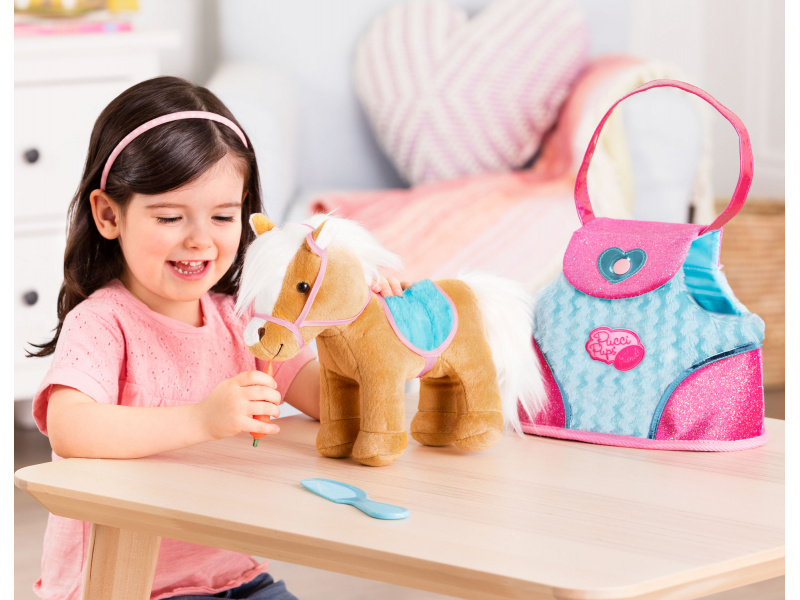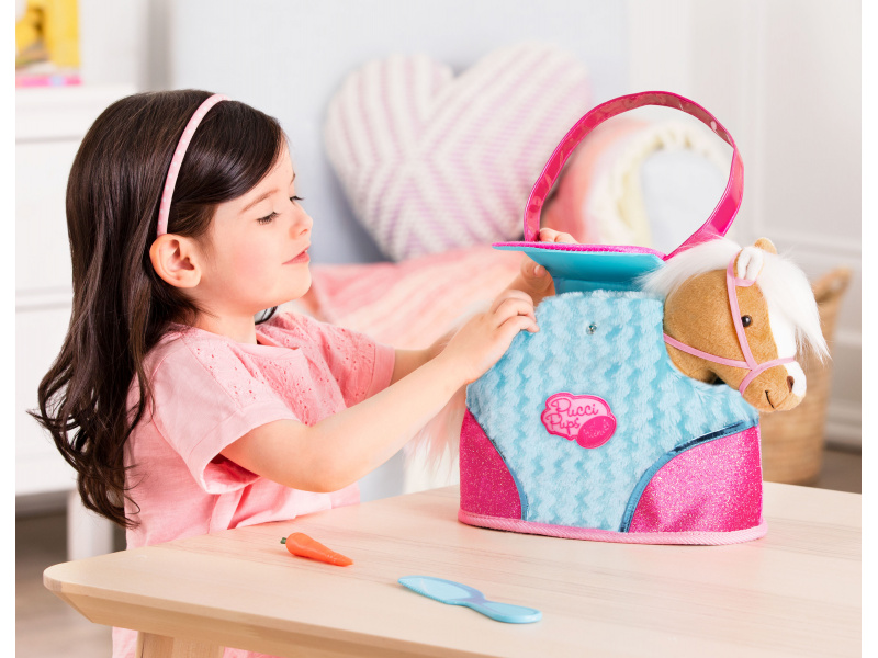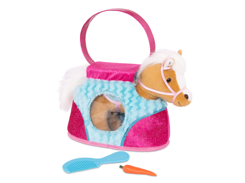 Nádherný plyšový poník v kabelce s krásným potiskem je vždy připravený na mazlení i na procházku. Miluje vyčesávání své hebké hřívy hřebínkem a díky kabelce si jej vaše dítě může vzít kamkoli. Kabelka má postranní otvory, aby poník při přenášení viděl na svět. Obsah balení: kabelka, plyšový poník, hřeben, mrkvička Rozměry: cca 25 x 15 x 23 cm Vhodné pro děti od 3 let.