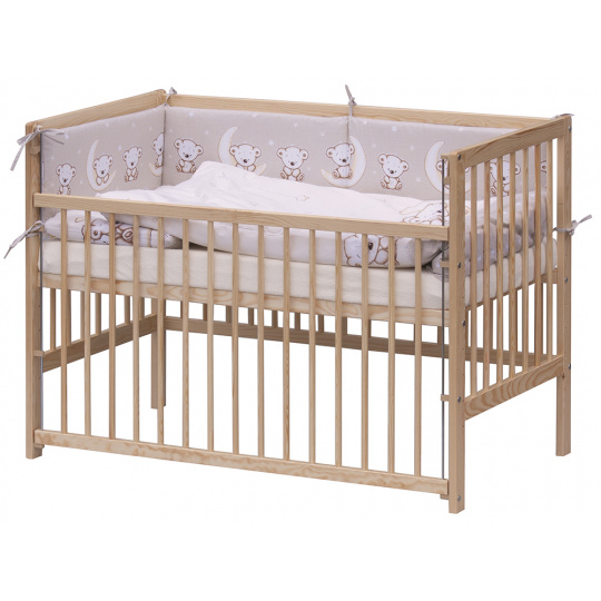 1 . Dětská dřevěná postýlka 120x60 cm - přírodní, masiv borovice, stahovací bok, 6 poloh roštu, nohy postýlky jsou předvrtané pro možné nasazení koleček