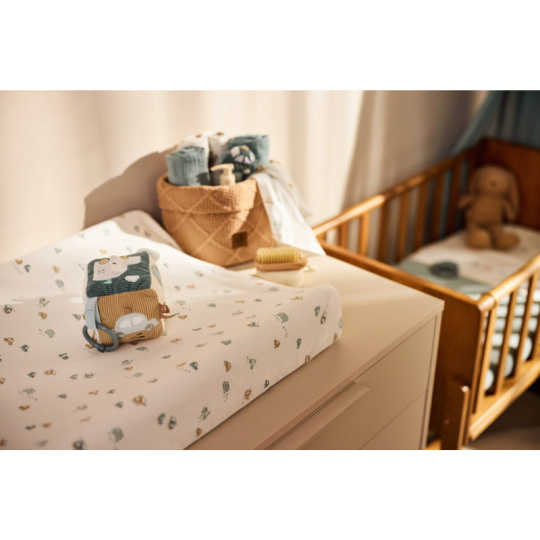Žerzejový potah s krásným potiskem je určen pro potažení přebalovací podložky formátu 70 x 50 cm. Díky elastickému pásku na okrajích potah drží na podložce a neshrnuje se. Měkký bavlněný materiál potahu je pro dítě příjemný a zajistí, že ho přebalovací podložka nebude studit při doteku s pokožkou. Složení: 100% bavlna Rozměry: 70 x 50 x 10 cm Možno prát v pračce na 40°C.