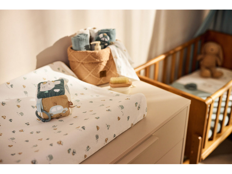 Žerzejový potah s krásným potiskem je určen pro potažení přebalovací podložky formátu 70 x 50 cm. Díky elastickému pásku na okrajích potah drží na podložce a neshrnuje se. Měkký bavlněný materiál potahu je pro dítě příjemný a zajistí, že ho přebalovací podložka nebude studit při doteku s pokožkou. Složení: 100% bavlna Rozměry: 70 x 50 x 10 cm Možno prát v pračce na 40°C.
